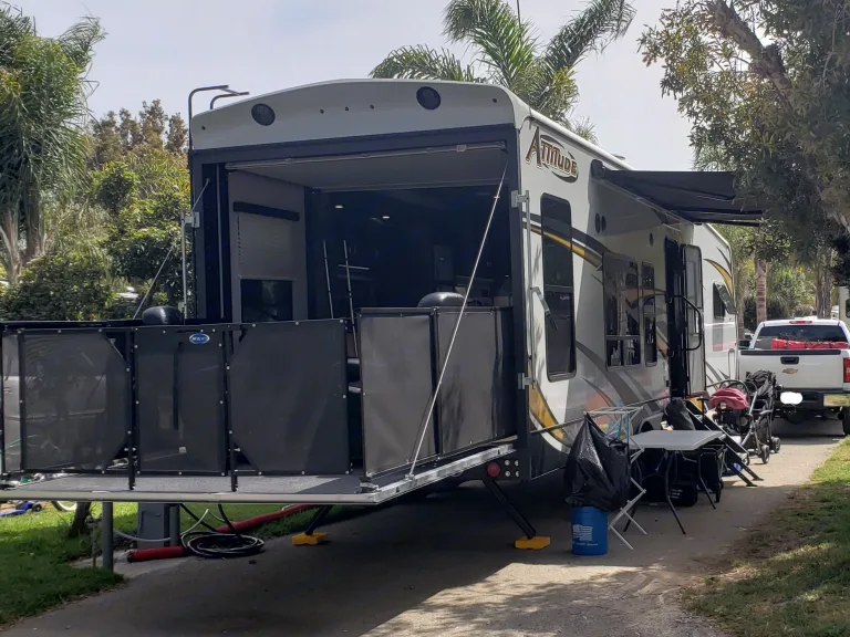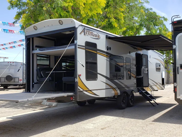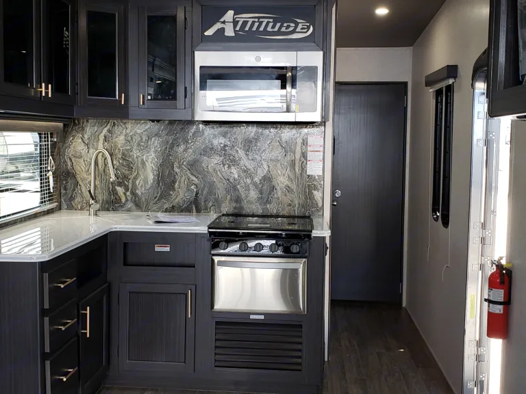Hit the road in style and bring all you do with you! This rugged Attitude toy hauler is perfect for outdoor enthusiasts, families, or anyone looking to explore without leading comfort behind. Whether you're heading to the mountains, beaches or deserts this rig is ready to provide a cozy home like stay.It Will NOT fit side by sides.Must present a Driver's License and Proof of insurance for pick up.What's included• This unit has a fully equipped kitchen including coffee maker, plates and utensils.