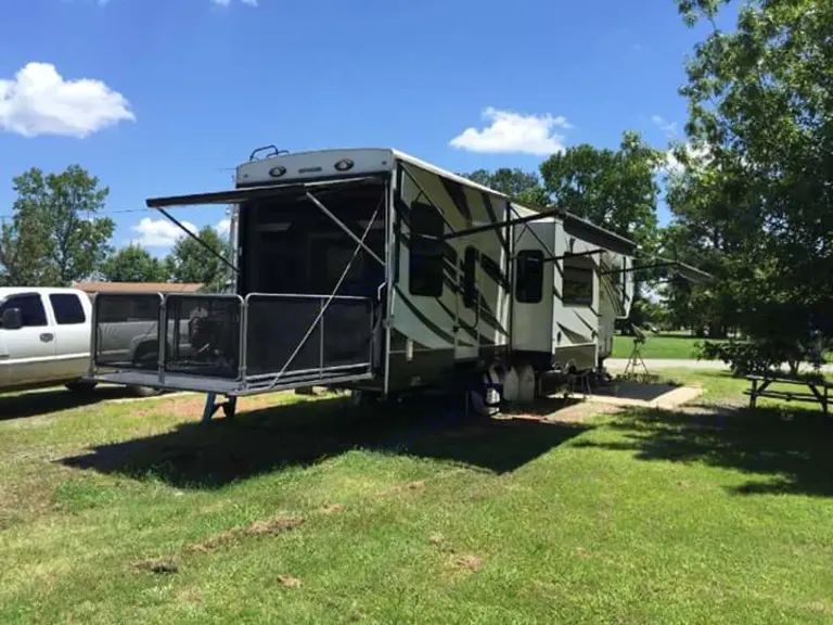 Keystone raptor sleeps betwee 9-10 people. One full bath and one half bath master bedroom with attached bathroom. Kitchen living room combo with loft. Back sitting sleeping room with half bath. 2 queen beds on electric glides one comes down sor back room couch or borth down for 2 queen beds bacck outside deck. Has a. 55000 generator and also has a seperate gas tank on back of rv