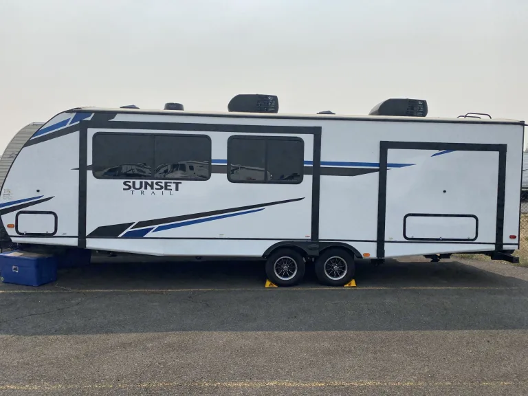 Brand new 2021 Sunset Trail Travel Trailer with 2 slide outs 2 A/C units,electric water heater/50 amp hookup/comes with 30 amp hookup convertor. If you run both A/C units at a 30 amp site it will trip the breaker.*Bedroom with slide out*