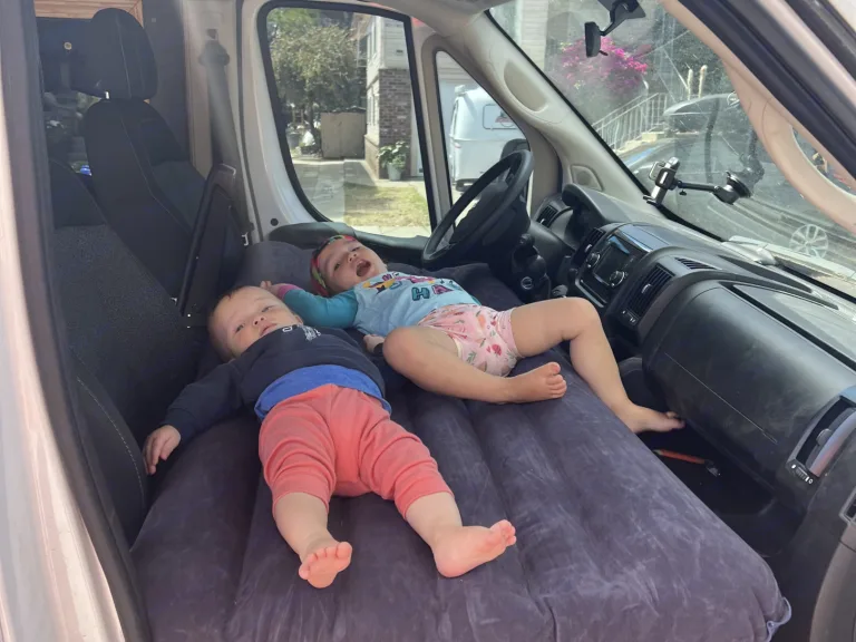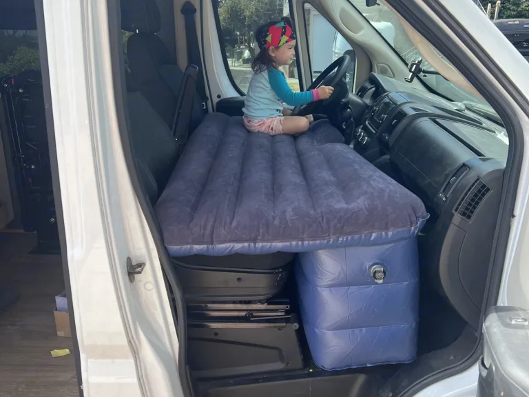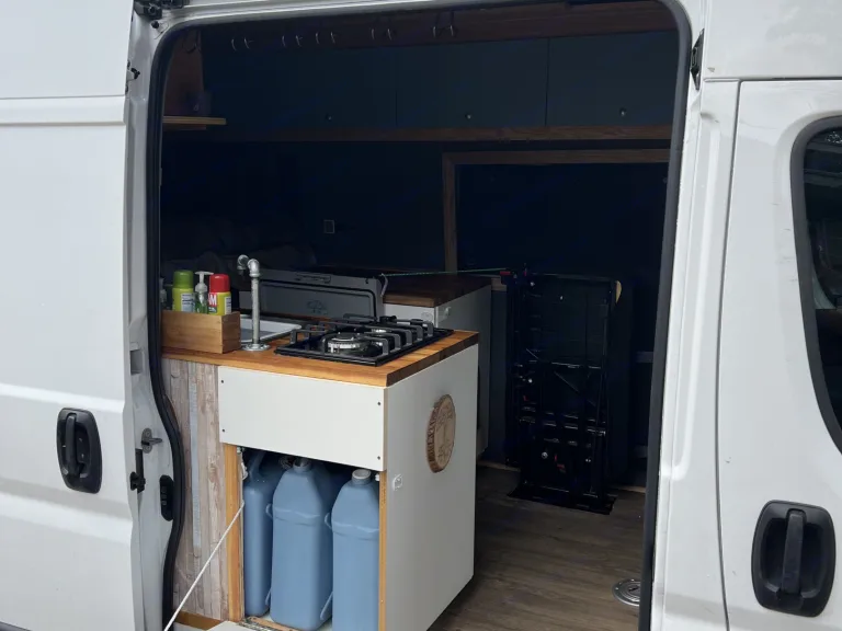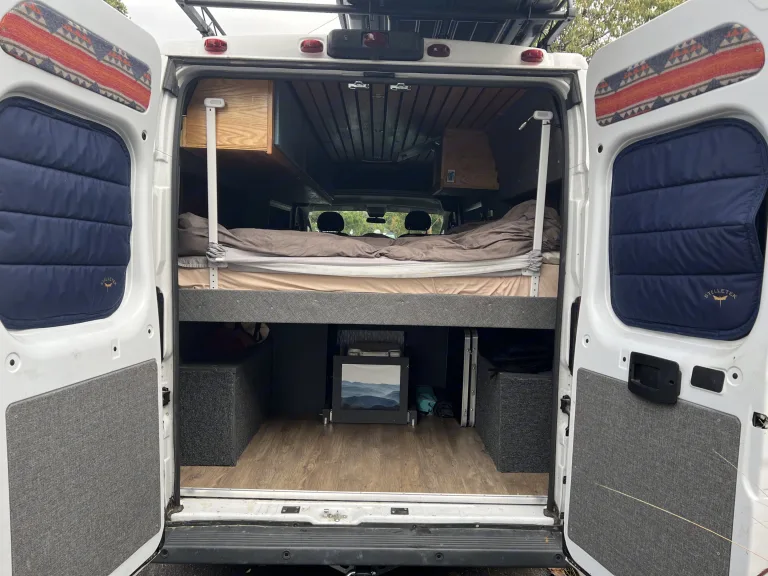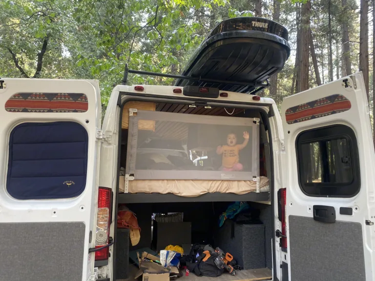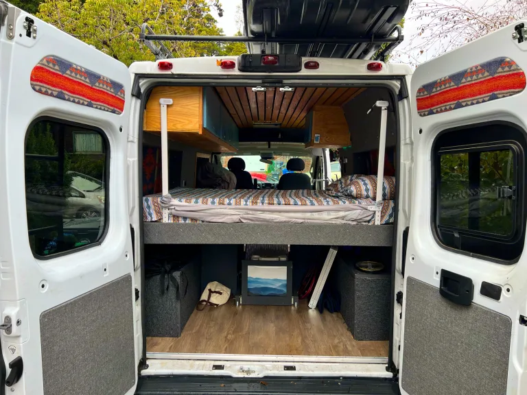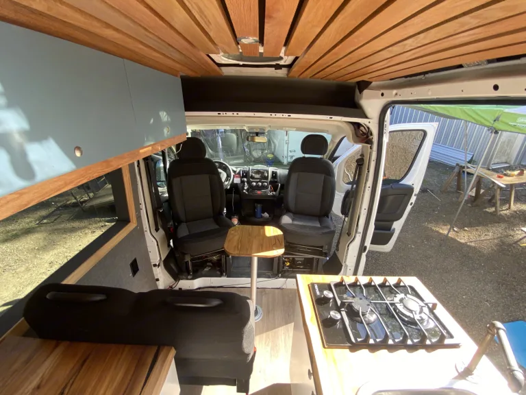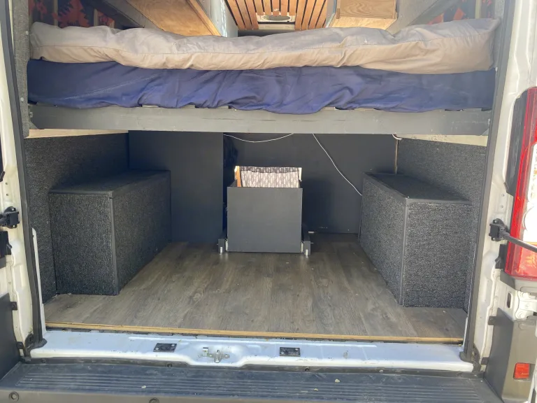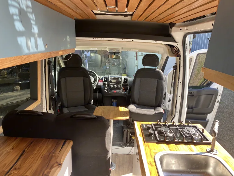 There is a comfy double rear seat that folds up into the wall for space efficiency. These are equipped with CRS hooks so they are compatible with car seatsExtra giant (but low profile) Thule Storage Box on roof of van200ah battery charged by 300 watts of solar, the alternator while driving, and plug-in shore power will keep you fully charged throughout your trip. I have never ran out of juice while leaving the electric cooler on for weeks at a time.Top of the line Webasto recreational heater to keep the cabin warm when at your camp site during the cold nights (ran through the gasoline tank)