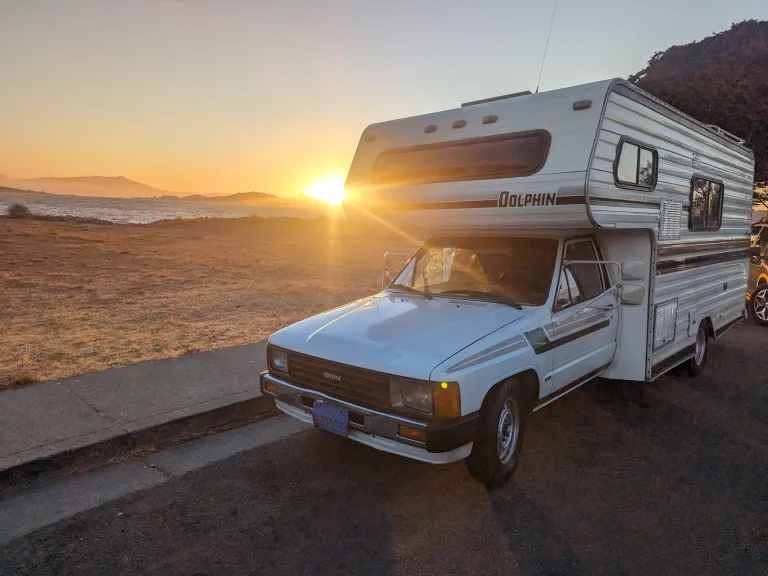 Year: 1984 (the last year of the carburetor so no EMP worries) This is a classic original Toyota Dolphin (the best) I have owned it for over 15 years and have taken it up to Mount Shasta, Lassen, and recently down to San Diego. Have recently invested in redoing the electric system and put in a new coil and alternator, mostly newer batteries including a deep cycle, plus new tires.12-16 MPG (note that this makes a huge difference vs. your standard RV