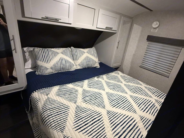 Stay on 2 acres near Rowena Marina (4 minutes away) or choose to be delivered!Exceptionally functional design allows for maximum use of space for quality living on the go. Sleeps 9. Private queen master bedroom in the front and a separate bunk room with 4 bunks in the rear. Full size fold out couch and dinette offer more sleeping room. The beds all have bedding and quilts.Power slide, large power awning, along with an outdoor kitchen. The stocked kitchen has a large refrigerator with a freezer, 3 burner stove, oven, microwave, and added electrical appliances for use with shore power. Coffee pot with cups will be available. Dinette in bunkroom adds to your dining space.The bathroom has plenty of counter space which is hard to come by in an RV. It features a toilet, sink, and tub/shower.For your outdoor pleasure you may have the use of our camping chairs, folding table, and rug.This rental is for a family-friendly camping experience. No smoking (cigarettes, marijuana, vaping, or otherwise) inside the camper. Unfortunately due to allergies, we cannot accommodate pets.No generator included.RV Will BE Delivered TO Your Campsite AND WE Will DO THE SET UP FOR YOU. We will require a photo of your ID. You are responsible for booking your campsite. Please reach out if you have any questions!What's included• Plates (8)