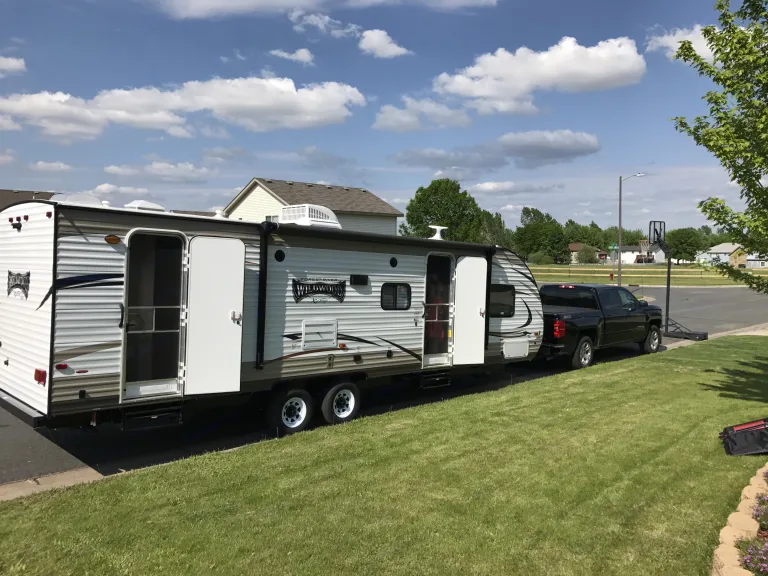32 Foot Forest River Wildwood X Lite 263Bhxl. Queen size master bed, two full in the bunk, as well as table and couch conversions. Advertized as sleeps 10 when all beds are double occupied. There is a large enough area to put a twin air bed in the kitchen if so desired.Unit has 1 large slide in the kitchen making the inside very spacious. Kitchen includes: Oven with stove top, Microwave, Refrigerator, and a "Walk In" pantry (your toes fit in it).This trailer has a power jack, power stabilizers, and power awning. I have a set of Anderson levelers and jack pads to help the process run smoothly. All these make it very easy to get set up on site.Indoor and outdoor speakers to provide music while cooking or sitting around the fire. The unit is cable ready should your site have cable and includes the 42 inch Sony Flat Screen that mounts on the wall.Currently have an Anderson weight distribution with anti-sway installed on the trailer. This means I will also provide the hitch that goes with it.I pull this trailer with a 2014 Chevy Silverado with a 5.3L V8 no problem at 65 MPH on cruise and up to 75 when passing semi traffic.We have only had a 5 trips in this trailer since buying it new. This includes a trip from Minneapolis to near Rushmore in South Dakota. This means the trailer is still like new.