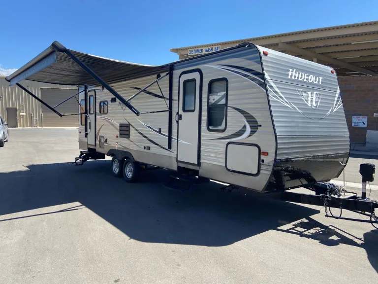 This is one great Hideout by Keystone. It’s roomy, half ton towable, and has the features you are looking for to make your experience great! This camper sleeps 6 comfortably. Two people each in the Queen, the pull-out couch, and the convertible dining table. When you are inside, you can enjoy refrigerated air or heat provided by the propane furnace. There is a range oven with three ranges, a sink, 7 cubic foot fridge with freezer, a bathroom with tub/shower, and an outdoor shower for those times when you and yours are too messy to enter the camper. Or maybe you just like to shower outside! No judgement here. Just happy you are enjoying the camper. When your day is done, or when you just want to relax, the camper has a 32” Flat screen TV on a swivel that can be pointed at the living area, or the queen bed. The system can play DVD as well as connect to your blue tooth devices to access your music which can be played outside. The speakers are next to the power awning that helps to make for a fun hang out area just outside the camper.