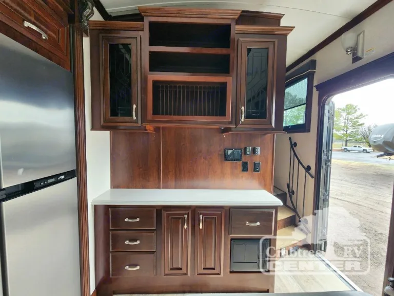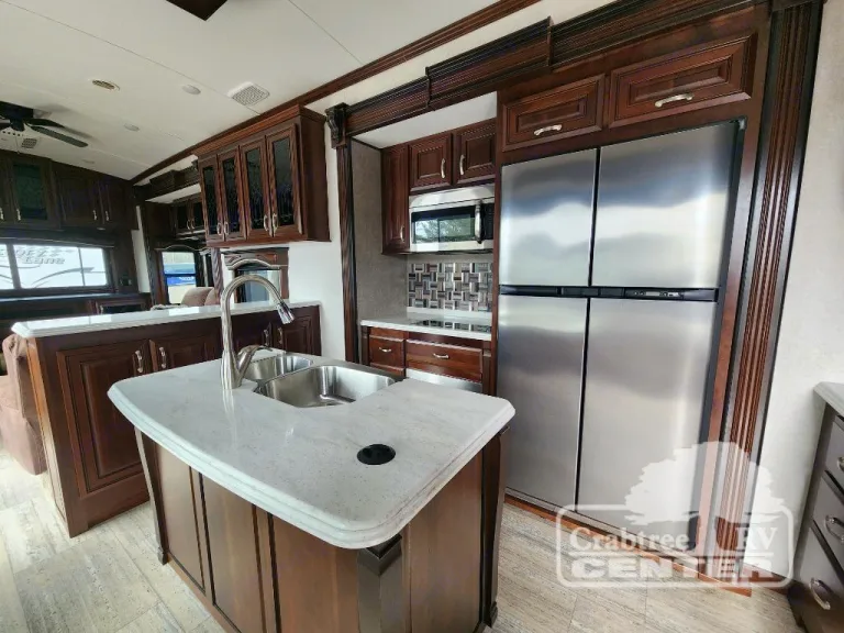 Enter through the 60" sliding patio door and notice the rear entertainment area with dual opposing slides. The full rear wall entertainment center features a TV lift and a fireplace beneath to enjoy. This room is perfect for entertaining family or friends.To the right of the patio doors there is a spacious kitchen area with dual opposing slide outs like the living area. A table/desk combination with four chairs fills the slide along the curb side, and the slide opposite features a residential refrigerator, a two burner range with overhead microwave oven, and a dishwasher. There is a bar top along the inside wall with storage below, a kitchen island featuring double sinks, and more storage along the inside wall in this kitchen area.Head up the steps toward the front to a side aisle bathroom on the left. There is a toilet, a vanity sink with overhead medicine cabinet, linen storage, and a 36" x 48" shower.*****Important Information*****