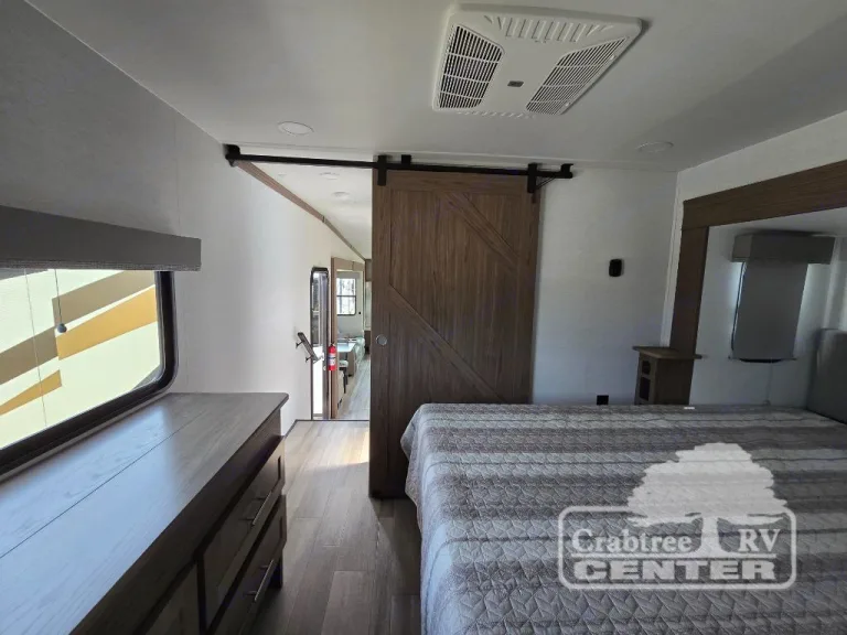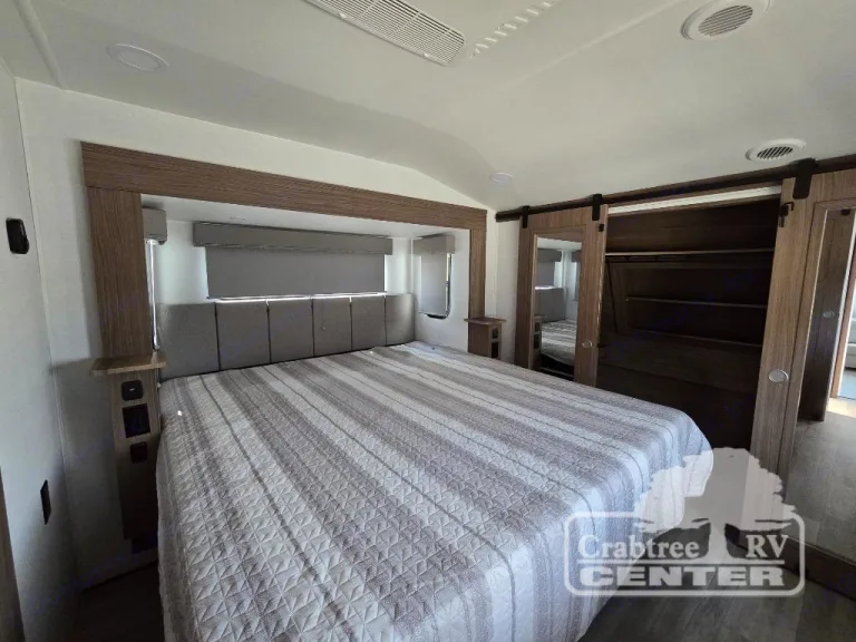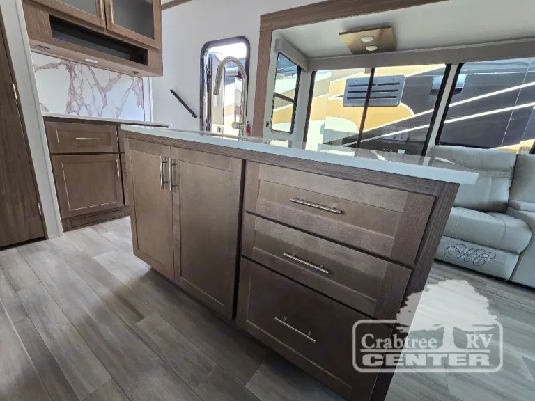 A kitchen island with countertop space makes it easy to prepare meals in this fifth wheel! The floating dinette table has two chairs on one side and a movable ottoman with flip up storage on the other side to keep your games or extra table cloths in. You can also store your favorite snacks inside the pantry! The front private bedroom has a queen bed. There is also a dresser and large wardrobe for storage. The rear living area features a dual recliner theater seat across from an entertainment center with a 50" class Hdtv with hidden storage behind it and is also on a swing mount for all to see even at the rear sleeper sofa!*****Important Information*****