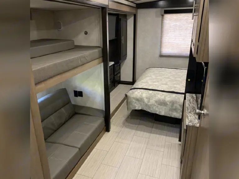Great rental unit for families! Enjoy exploring the outdoors in style.Class A Unit that Sleeps 8 Comfortably, but can accommodate up to 10. King Bedroom in the rear with slide out, 2 single bunks in the bunkhouse, a drop down double bunk above the cockpit area, and couch and dinette that both fold down into single bunks as well. Two slide outs (one on the master and one on the living area), 4 TVs including an outdoor TV. Power awning and electronic automatic leveling system make setup a breeze.