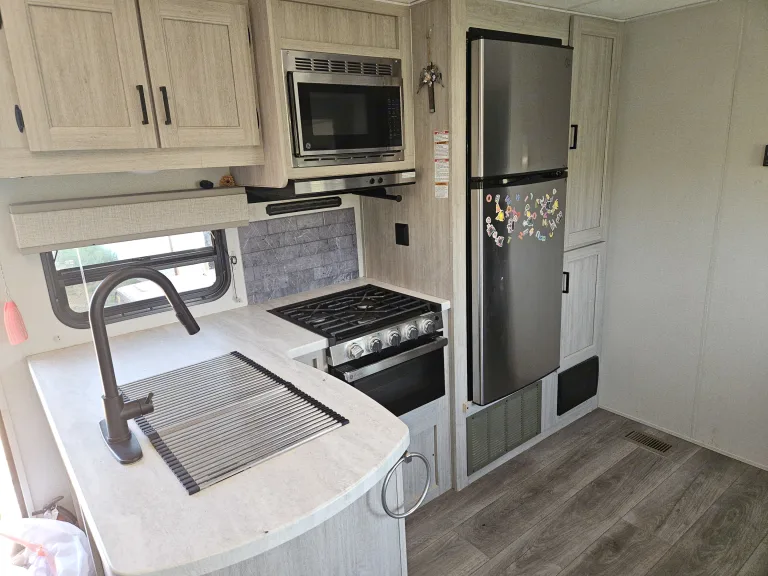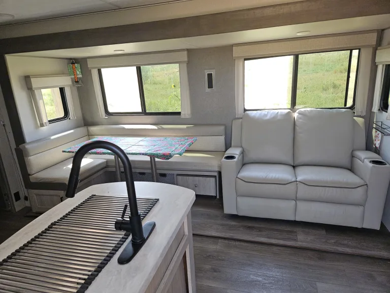 Step inside this beautiful 36-foot travel trailer and instantly feel at home. With a light, modern interior and thoughtful features, it’s perfect for family getaways, couples’ retreats, or group camping trips.