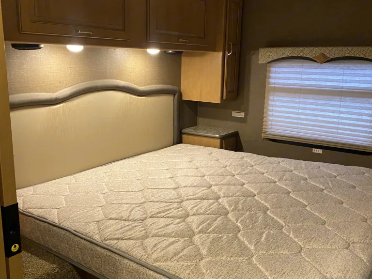 This inviting RV rental bedroom features a large bed with a patterned mattress, padded headboard, overhead cabinets, and a window with blinds, plus an air conditioner for comfort.. Thor Hurricane 2017
