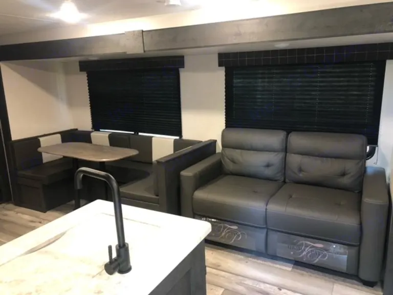 Adventure Awaits!!Our unit is perfect for your next family adventure with 2 bedrooms with queen beds, dinette and sofa that provide even more sleeping space, along with 2 AC units, full bath, 1 electric slide and plenty of storage.The master bedroom comes with fresh linens and pillows for the queen bed. Hanging storage cabinets located on both sides of the bed and overhead storage. Need more space than that? There is also stowaway storage just by lifting the foot of the bed. USB and/or electric outlets on either side of the bed with a small phone ledge. And did I mention its own AC unit?Main living comes with 1 electric slide that houses the U shaped dinette and sofa. Both in which turn into beds. You have a pantry, storage cubbies and cabinets to accommodate any food and necessities you may need. Under the wall mounted 32" smart TV is an AM/FM sound bar that is Bluetooth compatible that also pairs with 2 outdoor speakers so you can enjoy your music not only inside, but outside while you sit under the awning enjoying your stay.