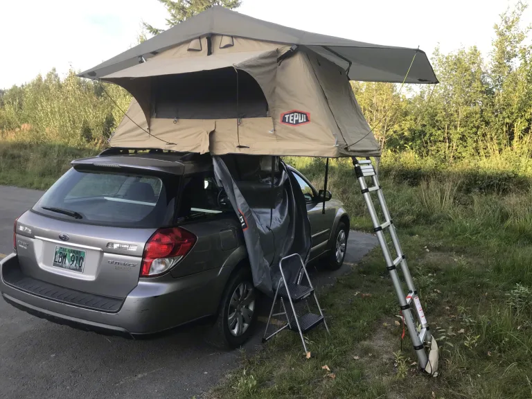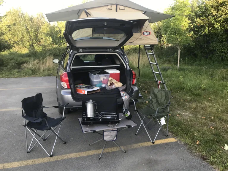 The SUV has good storage available behind the back seat. The rear seats fold down for additional storage if needed. Rentals require a 3 day minimum. Discounts are offered for extended rentals.The storage area includes two camp chairs, folding table, storage bin with cutlery set, two burner propane stove, and a two step ladder to help set up the tent top, and a cooler.Year: 2009 Automatic transmission, 2.5L 4 cylinder, All wheel drive, ABS, dual Supplemental Restraint System (Dual Air Bags), power windows, power door locks, air conditioning, cruise control and more. This is a maroon Subaru Forester, but the photos have not yet been updated from a silver Subaru Legacy. Tent set up and configuration is identical and we plan to update photos this spring.