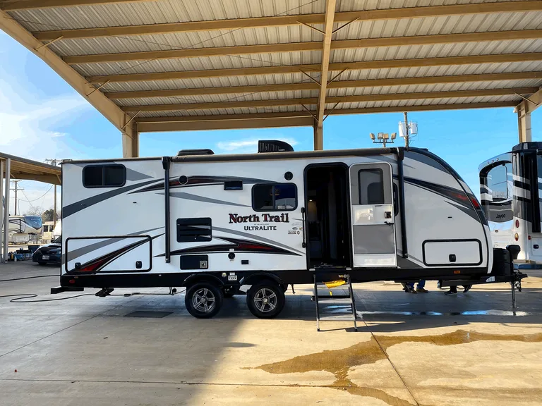 It has one slide-out to give you more room in the main area. 360 degree rotating TV, indoor and outdoor speakers, radio, power awning with LED lights, inside and outside shower, inside and outside kitchen, inside and outside fridge, and much more. It gets really hot sometimes and most RV's and Trailers in Alaska don't have an AC.. but this one does :) It is 28' and easy to tow.