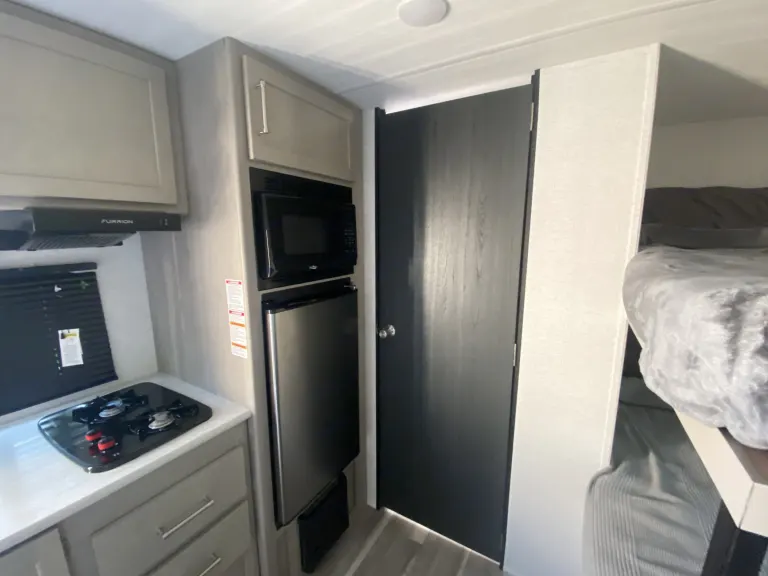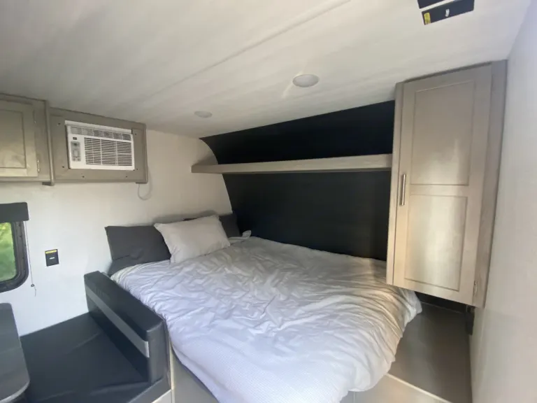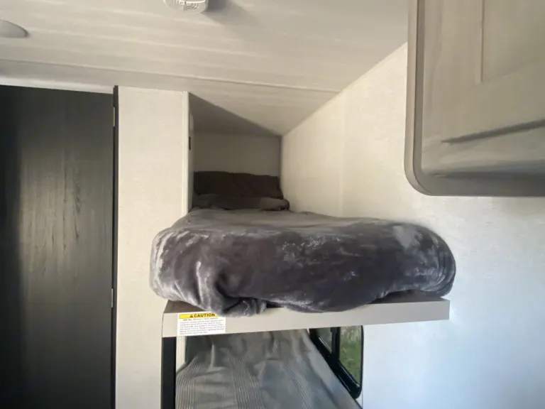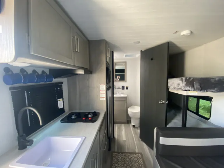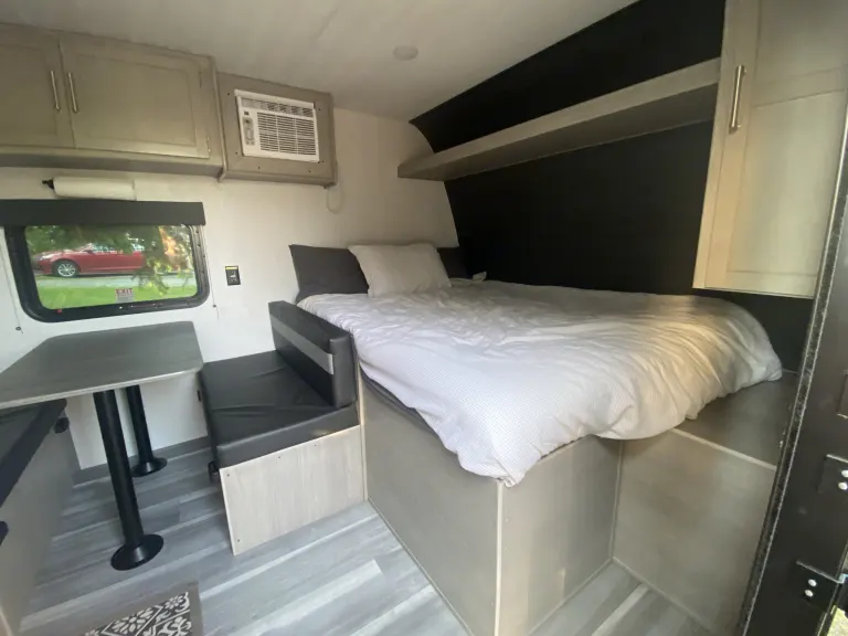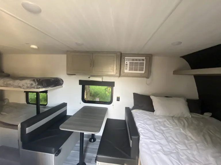 This spacious yet Mini travel trailer offers an upgraded rv queen bed, two bunks, and a dinette that converts to a sleeper for your smaller campers. Comes equipped with sheets, basic kitchen wares including spatula, eating utensils, dishes, pot and pan, coffee pot, paper towel, and RV-safe toilet paper. Plenty of storage to stash paddle boards, life vests, and fishing gear. Enjoy your Alaskan adventure without missing the comforts of gas burners to cook on, heat, AC, and running water. Don’t forget the automatic awning for shade while you enjoy all that Alaska has to offer! What's included• Paper towel