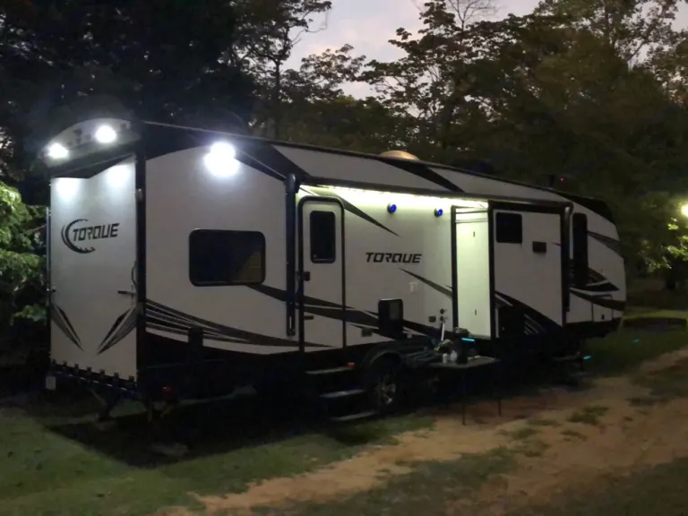 2018 torque camper 30 foot toy hauler sleeps six comfortably with one king bed in the front two queen bunks in the back toy hauler ramp comes down into a patio camper has microwave dishwasher Keurig coffee maker ice maker gas stove with oven two refrigerators two TVs two bedrooms two tables fireplace two entrances with indoor outdoor stereo DVD player large stand up shower with towels available also bedding available this camper is very modern and spacious 8 foot ceilings and all the camping accessories you would possibly need are available with our one stop camping spot....Minimum of three day stay and