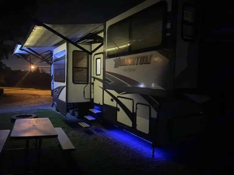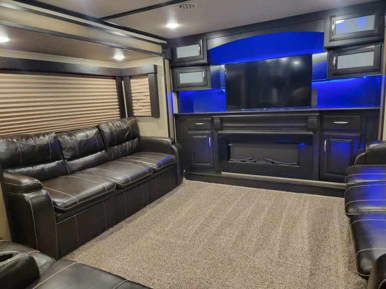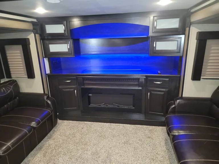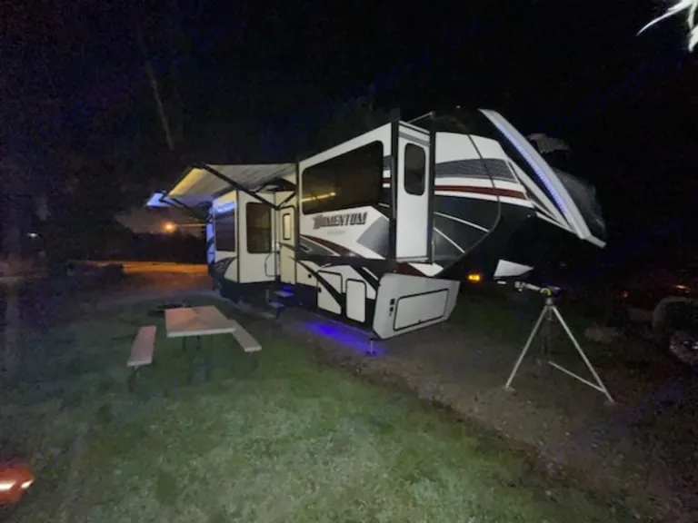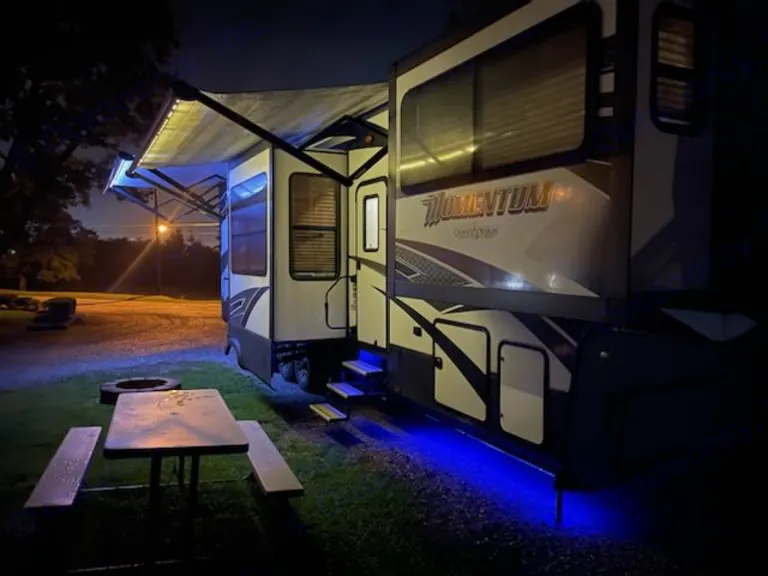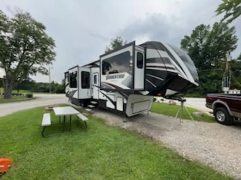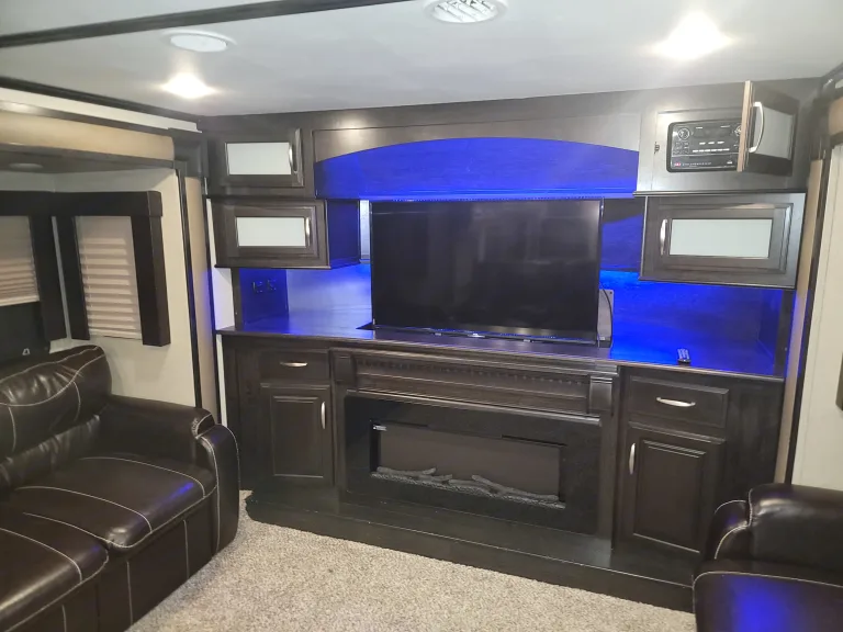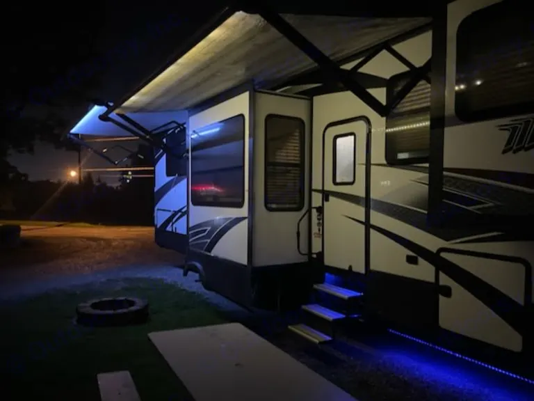 You will love all of the entertainment space that this RV has to offer. This unique toy hauler fifth wheel features a garage below the rear bedroom, a front living layout. In the rear beneath the master bedrm you will find a deep garage that is perfect for your street bike or golf cart. Loading and unloading will be easy using the rear ramp door. Above the garage space the master bedroom with a great bed. Enjoy a great night's sleep on the queen size bed with nightstands on either side, plus overhead cabinets. There is plenty of storage space for your clothing in the bedroom slide out with two closets and drawers, plus there is also a wall mounted LED TV . the bath is in the hallway between the bedroom and kitchen area. Inside there is a shower with skylight and seat, toilet, and a vanity, plus plenty of storage. Step down outside the bathroom into a spacious kitchen and dining area featuring two opposing slides. There is a free standing dinette in the curb side slide out. Opposite a second slide features a pantry, a three burner range with overhead microwave oven, and four door refrigerator. Along side the 3 burner stove is a huge kitchen pantry big enough to store all of your family’s food and cookware. A hutch with more counter space and overhead storage is located along the interior wall just inside the main side entry door. The kitchen island also features a double sink for easy clean up. Up three steps takes you to the raised front living and entertainment area. There are two lounge chairs facing the entertainment center. Both slides in front feature a queen size tri-fold sofa which allows for plenty of seating during daytime hours and sleeping when you entertain overnight guests. The front wall offers a telescoping TV with fireplace and overhead cabinets making this a great space to enjoy the company of your family and friends! Don't forget the outdoor kitchen which includes a two burner cook-top and counter space, a small refrigerator a third LED TV.What's includedYou will have everything you need to enjoy your time away from home. We have all bed linens and pillows along with bath towels, washcloths, and hand towels.The kitchen has lots of utensils and small appliances so you can cook up a meal for the family.RecommendationsPlenty of places to visit in the area. Pigeon Forge is a great family destination. The Smoky Mountains are awe-inspiring - great for the outdoorsy type - plenty of hiking, fishing and exploring to do.Whatever you would like to do from where-ever you have chosen to be your home-base, we'll help make it a great time.