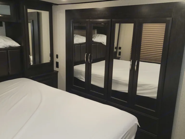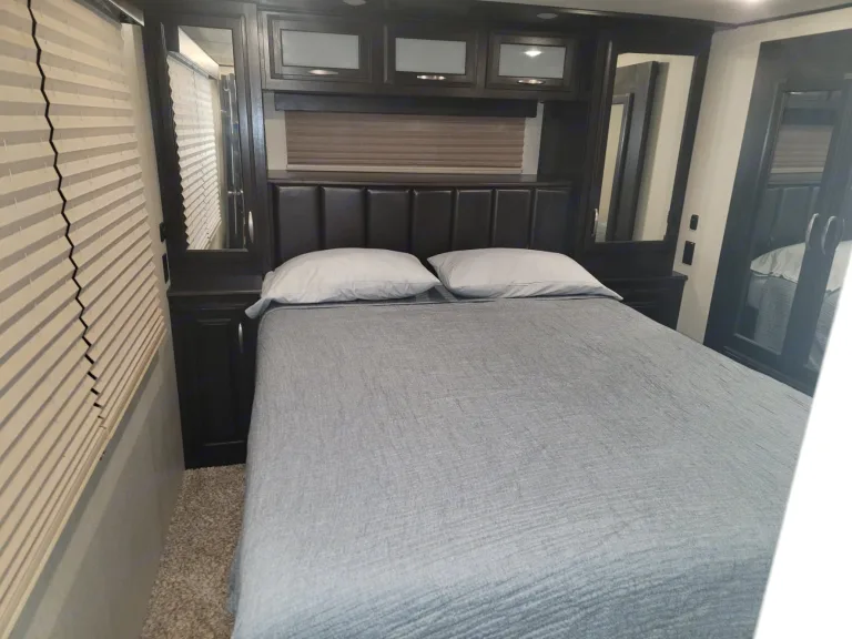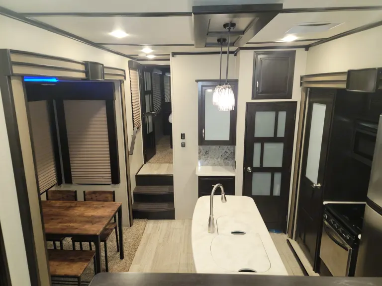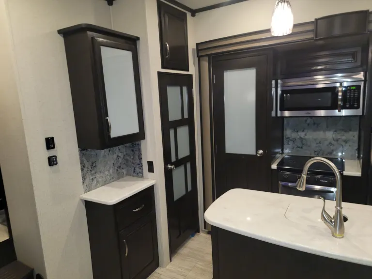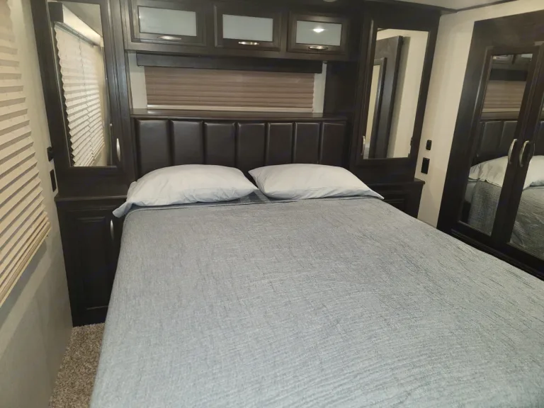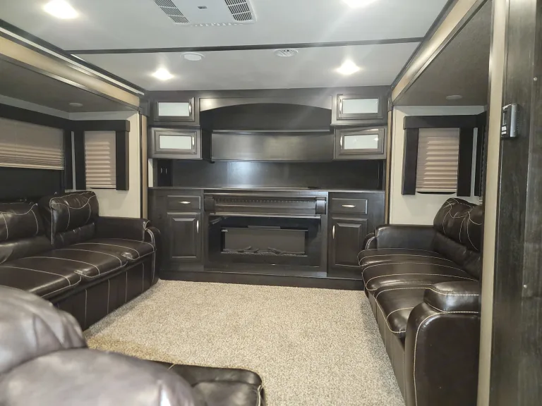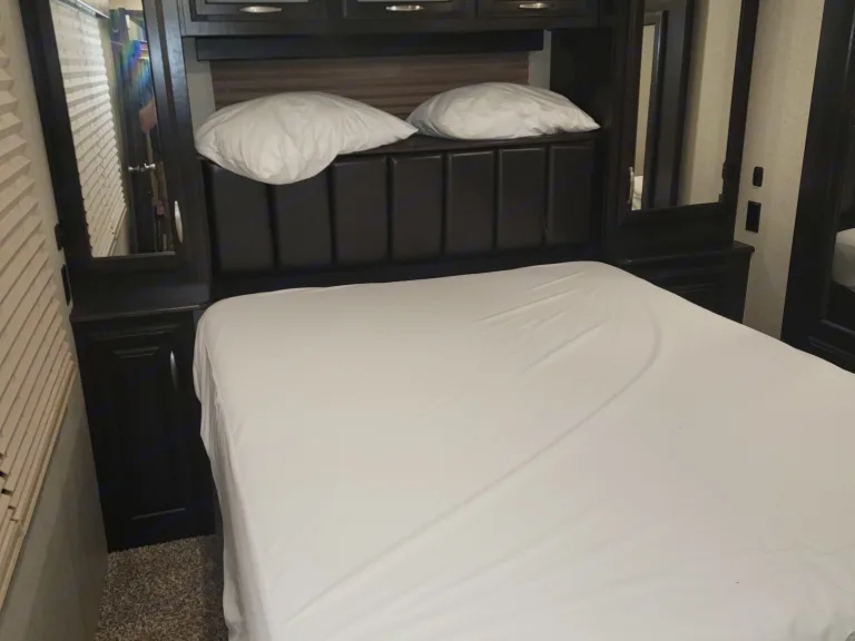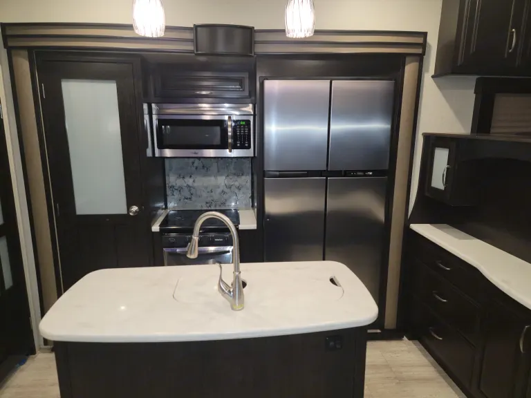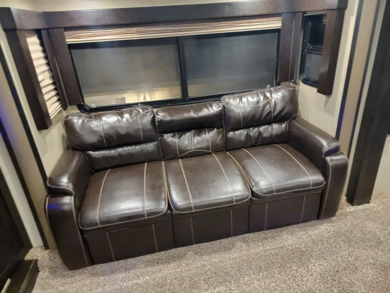 You will love all of the entertainment space that this RV has to offer. This unique toy hauler fifth wheel features a garage below the rear bedroom, a front living layout. In the rear beneath the master bedrm you will find a deep garage that is perfect for your street bike or golf cart. Loading and unloading will be easy using the rear ramp door. Above the garage space the master bedroom with a great bed. Enjoy a great night's sleep on the queen size bed with nightstands on either side, plus overhead cabinets. There is plenty of storage space for your clothing in the bedroom slide out with two closets and drawers, plus there is also a wall mounted LED TV . the bath is in the hallway between the bedroom and kitchen area. Inside there is a shower with skylight and seat, toilet, and a vanity, plus plenty of storage. Step down outside the bathroom into a spacious kitchen and dining area featuring two opposing slides. There is a free standing dinette in the curb side slide out. Opposite a second slide features a pantry, a three burner range with overhead microwave oven, and four door refrigerator. Along side the 3 burner stove is a huge kitchen pantry big enough to store all of your family’s food and cookware. A hutch with more counter space and overhead storage is located along the interior wall just inside the main side entry door. The kitchen island also features a double sink for easy clean up. Up three steps takes you to the raised front living and entertainment area. There are two lounge chairs facing the entertainment center. Both slides in front feature a queen size tri-fold sofa which allows for plenty of seating during daytime hours and sleeping when you entertain overnight guests. The front wall offers a telescoping TV with fireplace and overhead cabinets making this a great space to enjoy the company of your family and friends! Don't forget the outdoor kitchen which includes a two burner cook-top and counter space, a small refrigerator a third LED TV.What's includedYou will have everything you need to enjoy your time away from home. We have all bed linens and pillows along with bath towels, washcloths, and hand towels.The kitchen has lots of utensils and small appliances so you can cook up a meal for the family.RecommendationsPlenty of places to visit in the area. Pigeon Forge is a great family destination. The Smoky Mountains are awe-inspiring - great for the outdoorsy type - plenty of hiking, fishing and exploring to do.Whatever you would like to do from where-ever you have chosen to be your home-base, we'll help make it a great time.