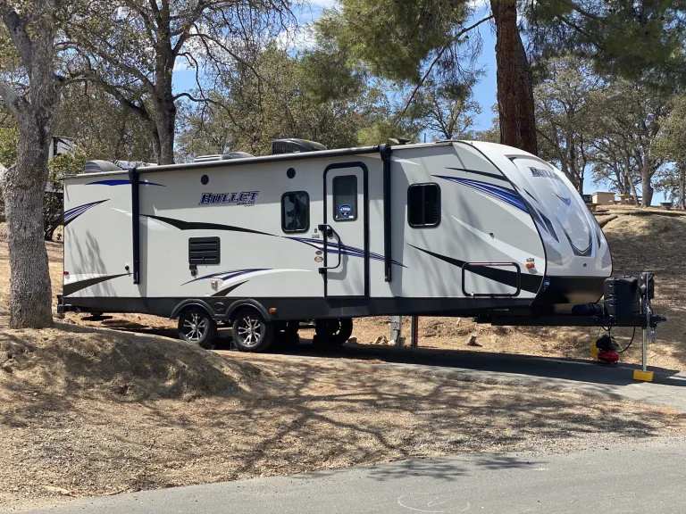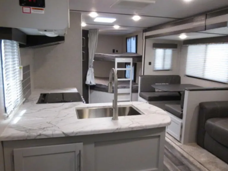 This trailer is loaded with everything you would want or need to thoroughly enjoy your next trip. Sleeps 6-8 comfortably with Queen master and two bunks. Table and couch fold out and are great children bunks. Lots of upgrades in this new trailer. We do not allow Smoking or Pets inside this trailer due to allergies. Half Ton towable. 31 feet @ 5464 lbs dry weight and 675 hitch weight. Trailer equipped with a Power tongue jack. We can provide a weight distribution hitch with sway control. Electric awning. HD TV with entertainment system. Fully insulated, this trailer maintains heat very well and stays cool with the onboard heater/AC. Basic cooking utensils, pots, pans, coffee pot, microwave etc.. are provided. Linens & pillows for the Queen and 2 Full Bunks are provided but we do not provide blankets so you may want to bring blankets or sleeping bags. Very easy to operate, all electrical and sewer hookup equipment is provided. You will not be disappointed traveling with this trailer. We can deliver and pickup within a reasonable distant and for a reasonable fee. We also provide 4 hours daily use of our small quiet 3800 watt generator and provide 2 full tanks of propane at no additional charge. Message us through the app and we will be more than happy to respond quickly and help you plan your next adventure.What's includedFresh Linens for Queen Master and two Full Bunks. 3 Camp Chairs. Large Outdoor Mat. Propane Griddle/Stove for outdoor use. Small Folding Outdoor Table. Plus misc kitchen items; paper plates, plastic utensils, bowls etc. We do not provide blankets so you may want to bring blankets or sleeping bags.Other things to noteNo Pets/Animals allowed in the trailer. No Smoking allowed in or near open windows of the trailer.