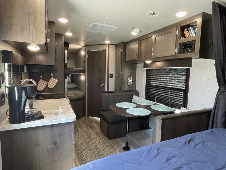 Your amazing camping trip will start In this beautiful brand new 2021 Jayco Jay Flight 224BH bunk house that sleeps up to 6 comfortably and comes fully stocked with all your camping essentials! Comfortable queen bed, 2 twin corner bunks and a 4 seater dinette.You will stay nice and cool with the ventilated AC or warm and cozy with the residential style furnace that provides a comfortable environment year round.While sitting by the fire, the camper comes with camping chairs and camping accessories.For no extra fee, we include: - cooking utensils - pots/pans - silverware - plates, bowls, cups - a coffee pot - coffee mugs - cutting board - knives - camping chairs and more!You will sleep like a baby in the Queen bed that has 2 pillows, fitted, top sheet, and comforter. Your kids will have fun in the bunk beds that also have pillows, sheets and blankets.Keep yourself or the kids entertained with the flat screen TV.This is a medium weight camper that can be towed by many full-sized SUVs and 1/2 ton pickup trucks. All you need is a 2" receiver, 7 pin connector and electronic brake controller on your tow vehicle and we provide the ball, weight distribution hitch, and all the hardware needed for towing.Weight as Provisioned - 5,000 lbs