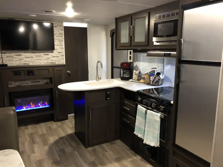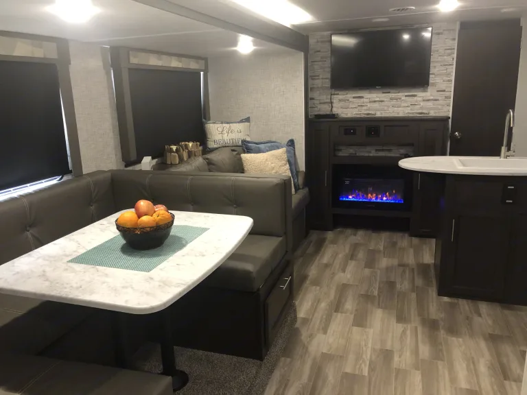 Vacation ready, 2 bedrooms, YES, there’s 2 bedrooms, great family trailer that sleeps 8 comfortably but can sleep 10 with separate bunk room for the little ones. Large dinette allows for extra sitting and fireplace makes for romantic nights, once kids are asleep!!! Outdoor kitchen, outdoor shower and outdoor speakers makes the camping experience that much cooler!!! Large entertainment center with 40" TV and Bluetooth stereo in living area. Comes with complimentary coffee/tea bar and S'mores kit. Fully equipped kitchen (dishes for 8, cookware, utensils, knives, bowls, barbeque tools, coffee maker, can opener, wine opener, etc) RV toilet paper, 8 camping chairs, camping table, camping lantern and outdoor camping mat included in nightly rental. Please bring your own linens, pillows, towels, etc as we do not supply those items. Generator available for additional nightly rental fee. Pets acceptable up to 25 pounds. No festival rentals allowed. Delivery only with this rental, no towing by renter. Delivery, set up and pick up, up to 50 miles, round trip is $200. Round trip from 51 to 100 miles is $275 and 101 to 150 miles is $350. No delivery over 150 miles round tripOther things to notePlease note, we do not offer any linens, towels or pillows. You will be responsible for those items. If dry camping, we recommend bringing paper plates, paper utensils and paper cups as to eliminate washing dishes to save water.