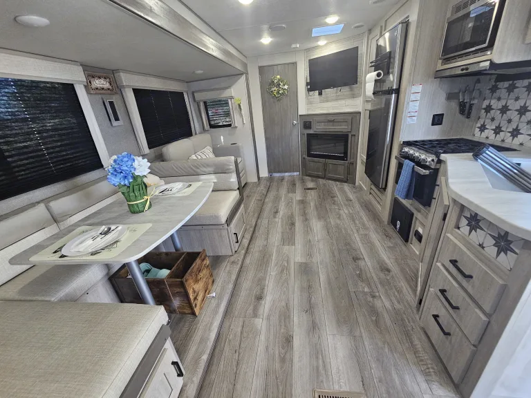 Living Space: Slide out to a grand dinette and sofa, perfect for hosting your own 'Trailer Talent Show'!
