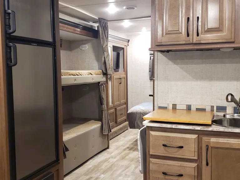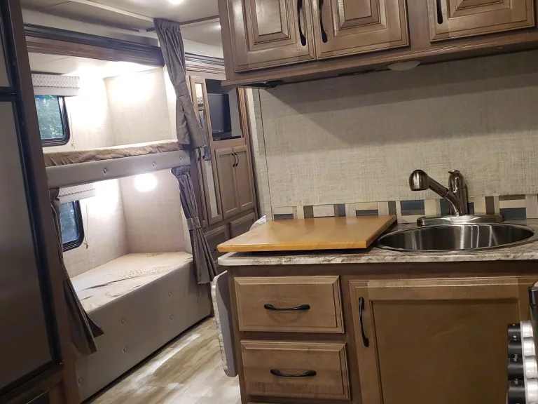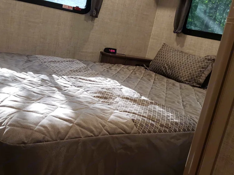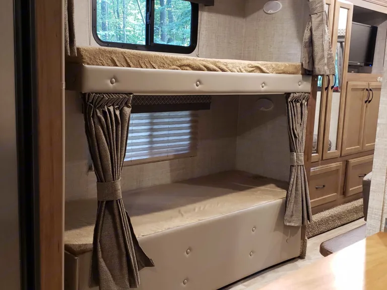 What's includedFeaturing a queen-sized bed, bunk beds, two fold down beds and an overhead double. The RV has two large slides that open up the living space, a sink, stove and oven, microwave, AC and heat. Tons of storage space for your clothes, food, and the adventure gear is in compartments underneath.This rig is also jam-packed with high-end components. The Conquest has a furnace/water heater system, generator and cabinetry complete with all kitchen and cooking supplies. This RV is simple to drive and has all the bells and whistles.What’s included: Camp chairs, towels and linens, grill, cookware and utensils, folding table, games, fishing gear, and corn hole!