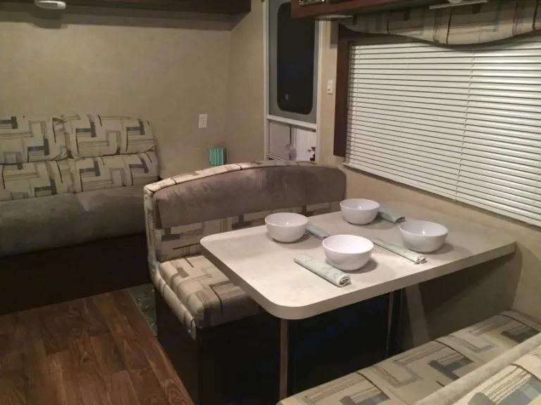 No-smoking. 18 feet, dry weight 3,600 lbs. Completely sealed and insulated frame, including underneath the trailer. Dual battery and dual propane tanks.Air conditioner, furnace, fan, microwave, stove, large, two door refrigerator/freezer, awning, stereo inside and outside, 6 gallon water heater, 50 gallon grey/black tank, 50 gallon fresh water tank, shower inside, lots of storage inside and outside, queen size bed (very comfortable), bunk and fold out beds. Sleeps 5-7. Small Dogs Ok!