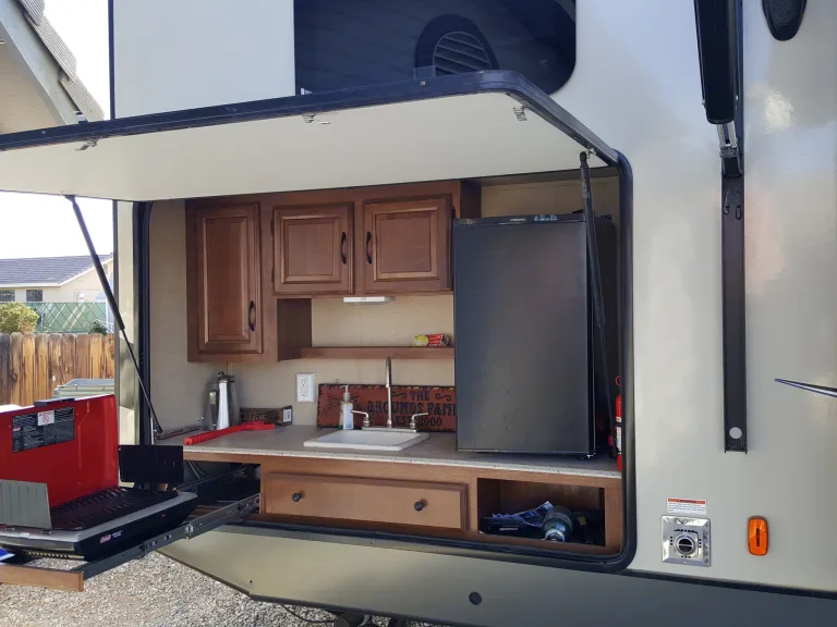 Great for large families with children, comes with a 32 inch swiveling TV you can watch from the children's bunk house or the living room area. You can comfortably sleep four children in the bunk house. The master bedroom has an upgraded (used once) queen size bed. The living room area has a dining table that seats four and can sleep two. It also has a sofa that seats two and folds out to sleep two. Central heating and air, fireplace, LED lights throughout, island with sink in the kitchen, corian counter-tops, has an oven and microwave. Has a kitchen out side for grilling with a sink and additional fridge for drinks. Large shower in bathroom and lots and lots of storage throughout the trailer.