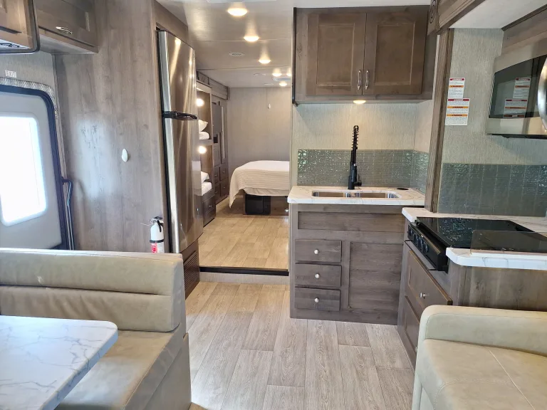 Perfect for state parks, local campgrounds, or cross-country trips.◇Flexible Pickup/Delivery Available◇We offer flexible pickup times or convenient delivery within 120 miles — including popular destinations like Wisconsin Dells. Every rental includes a detailed walk-through so you feel confident hitting the road (or relaxing in place!).>>>Delivery & Setup Details<<<Let us do the heavy lifting! We’ll deliver and fully set up the RV at your reserved campsite so it's ready to enjoy when you arrive.For campground deliveries, please ensure:●We (the host) are listed as an authorized guest or let them know that we'll be delivering for you. Confirm with your campground on how they'd prefer to proceed.●You confirm that the campground allows third-party RV rentalsThis helps avoid check-in issues and ensures a smooth setup process. If you're unsure, feel free to ask — we're happy to help you coordinate with your campground!☆☆☆This Class C RV has it all☆☆☆●Two slide-outs make the living space feel like a true home on wheels.●Sleeps up to 8 with a private master bedroom, cozy bunk beds fitted with lighting and electrical outlets, a roomy overhead bunk that easily fits two, and a convertible dinette and sofa for 2 more sleepers.●Fully equipped kitchen with 3-burner stove, microwave/convection oven, fridge/freezer, and plenty of pantry space.●Full bathroom with hot shower and flushing toilet!●Two TVs with Roku hookups (guests to log in to their own accounts) and comfy seating for relaxing after a day of exploring.●Professionally cleaned and sanitized before each trip.》》》》》》What's Included???《《《《《《Sleeping Arrangements: