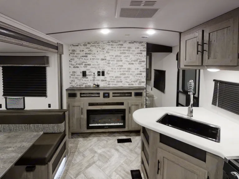 Our travel trailer is a brand new 2021 Keystone - Springdale, 24ft long. It is all fully updated - featuring modern appliances, an LED fireplace, a queen-size bed with memory foam topper, heat & air conditioning, an automatic awning, and outdoor kitchen set up featuring a gas stove top and mini fridge. It also has a master bedroom (with door) bunk beds, and a breakfast nook that converts into a bed. Can sleep 6 people comfortably.Only available as pick up (we do not deliver!)Electric stabilizers but we do not have any leveling blocks.