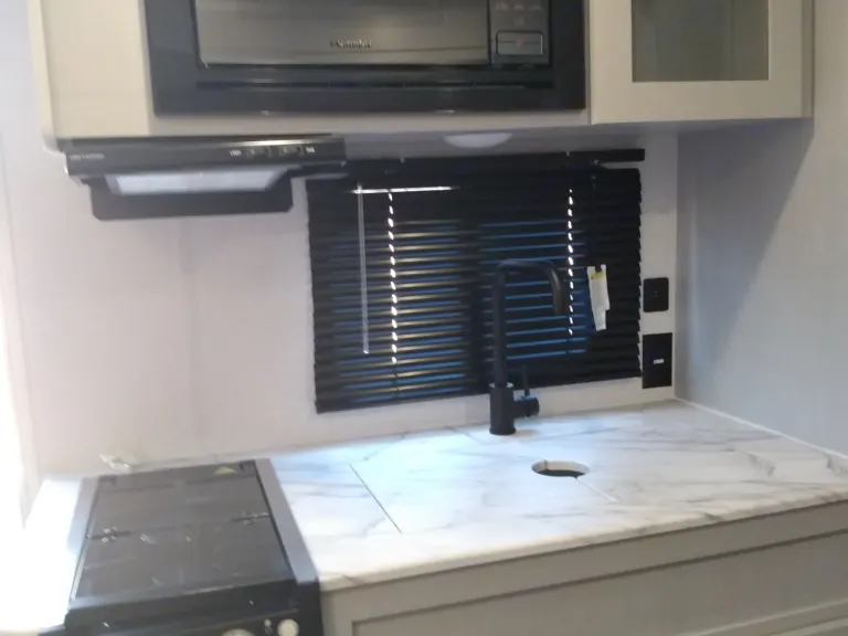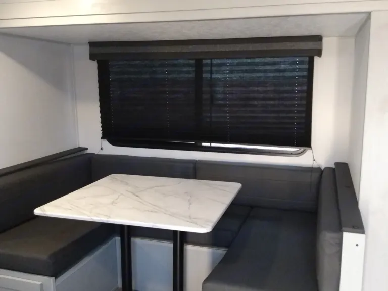 The front queen bed flips up to make a couch to create additional seating space during the day. Slide provides extra room for the U-dinette and panoramic window. The rear bunkhouse gives you double over bunks for additional comfort, while the outside kitchen gives you options for mealtime and entertaining with a grill and dorm size fridge.