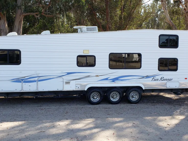 Welcome to our 32 ft Toy Hauler!Our Toy hauler is spacious and comfortable with tons of cabinet space. It has 3 queen beds and 2 twin beds which sleeps up to 8 people! The master bedroom is private with cabinet space to hold your belongings. Our bathroom has a full size shower, toilet, clothing closet, linen closet, medicine cabinet and sink. Both master bedroom and bathroom have closing accordion doors. The kitchen has a spacious fridge and freezer along with oven and stove. We have provided amenities such as pots, pans, cooking utensils, bowls, plates, cups, knives, forks, spoons, cooking sheets, dish soap, dish rack, toilet paper ,hand soap, towels, hand towels, paper towels and linen. The back of the trailer opens fully . We kindly ask that you let us know upon reserving this trailer if you will be hauling dirt bikes/ quads or anything motorized of any kind. If deemed, without our acknowledgement $100.00 will be deducted from your deposit. Please be honest with us, as it is very important that you know how to properly strap down bikes. Also we kindly ask that you do not bring pets. NO Cats or Dogs our children have allergies. NO Smoking you will loose your deposit. You also get Free Dish Network With ANY Delivery!!