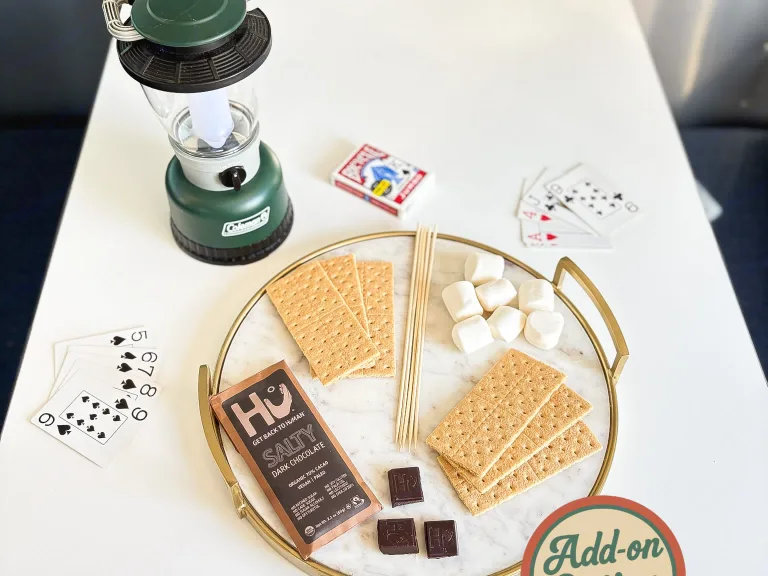 Marshmallows, chocolate, grahams, plus Yeti roasting sticks for a classic camp treat.