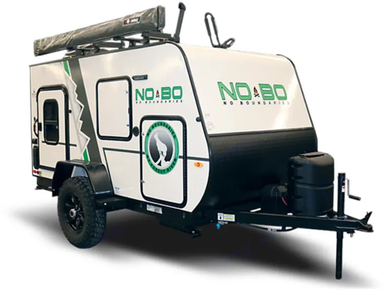 No Boundaries, with industry leading ground-clearance, larger diameter tires, and nimble suspension system, will allow you to explore and set up camp in places that would otherwise be inaccessible. An exceptionally light weight, versatile travel trailers towable by both 4 cylinder and 6 cylinder tow vehicles. Perfect for any outdoor s mud tires and high clearance allows you to smoothly run through the highways across the United States and conquer any off road and off the beaten path trails. The back of the trailer opens up to allow you to load up an ATV or simply enjoy the views as you lay down on the mattress. It has one door on each side for easy access to the inside of the trailer, folding tables, cup holders and storage. On the outside of the Nobo 10.6 you have a canopy that swings out and covers 270 degrees and provides plenty of shade and rain protection. The slide out kitchen includes a propane 2 burner stove, a fridge/freezer, a hose/sink area for doing dishes, a small pantry and a safety box. There are 30 gallons of fresh water on board to clean cooking utensils, rinse off gear or even shower on the spot!. The wheel wells are sturdy and strong enough to stand up on end and gain access to the roof rack where you can store additional gear.