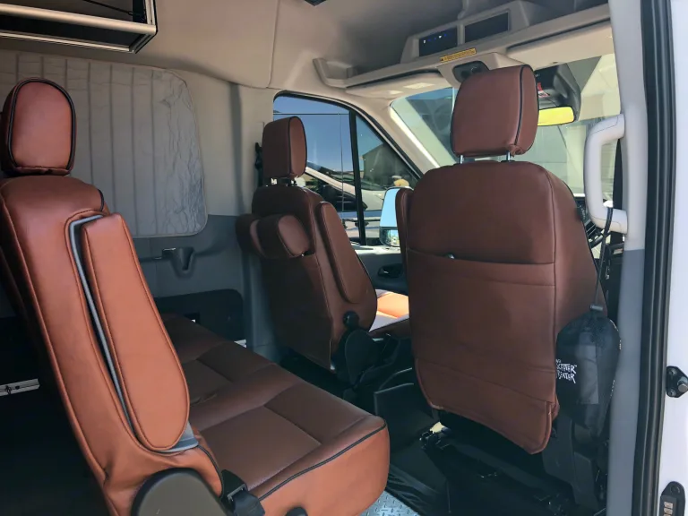My Vandoit GO comfortably (and safely) seats anywhere from 2-7 passengers, while sleeping 4. It has heat, A/C, a hot shower, a DVD and TV; a high-output stereo system; sexy lighting, and plenty of stand-up room for even tall people.GO has a Hydraulic bed lift, with a large stroke of upward and downward movement, which can change height positions based on cargo needs.The GO has a “garage” below the queen size bed lift with a gear slide or bunk bed in the “garage”.The GO leaves the rear passenger side shelves open for storage in the garage, with the electronics station conveniently located in front of the bed at the slider door, which doubles as a step onto the bed lift and allows for easy manipulation of the gaming system, DVD, solar system, sound, inverter and charging station.Pickup is after 3 PM and return is before 11 AM