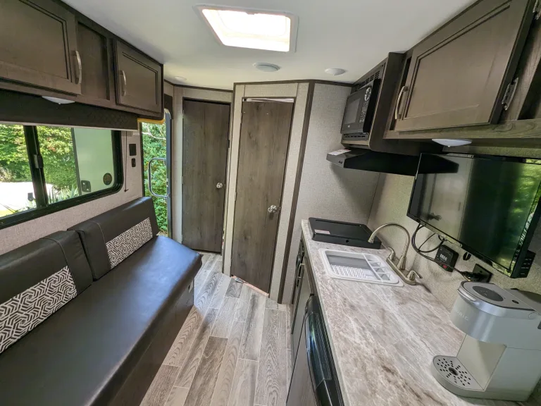 Weighing in under 2,400 lbs unloaded, this little trailer still almost magically boasts all of the top needs for getting out into the wild for trips of any length, like:- Dinette that converts into a full-size bed.