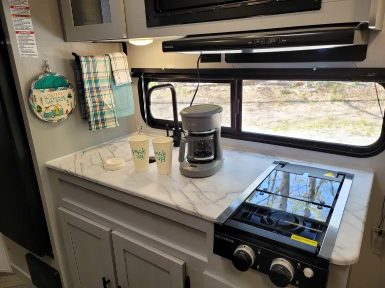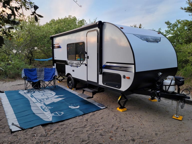 Our campers come stocked with cooking and dining equipment, mattress covers, coffee pot, cleaning supplies, toilet paper and paper towels, camp chairs, and outdoor rug. We provide a full propane tank and don't require you to refill it like many others do.