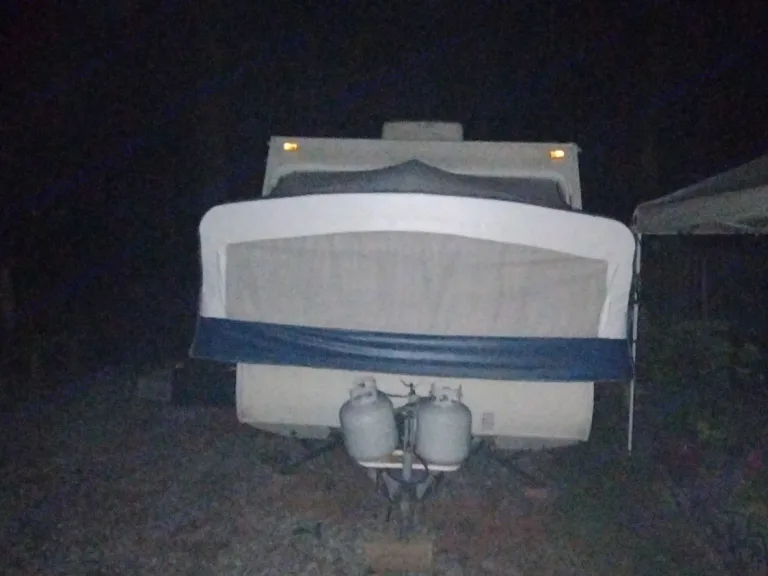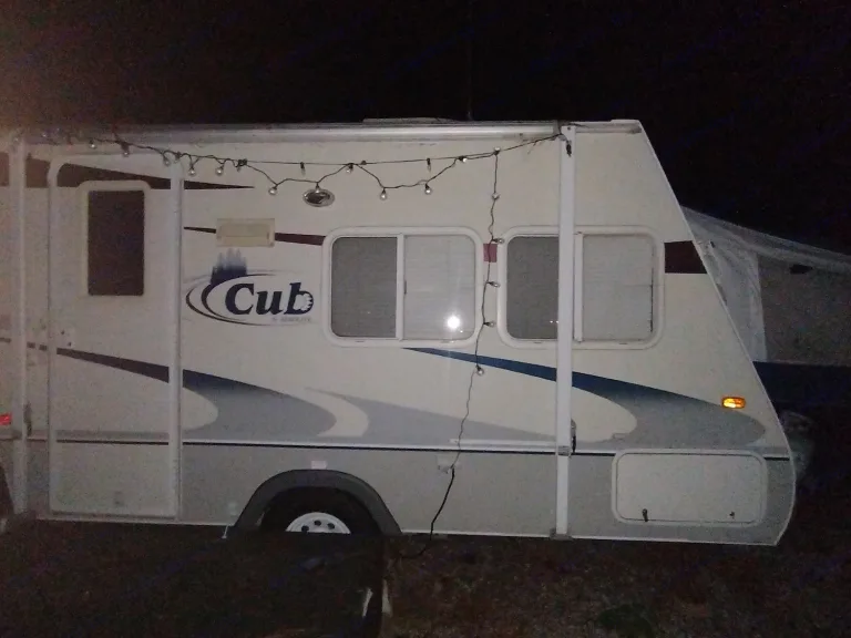 Beautiful lil camper with 2 sides pop out or one at a time so that everyone can sleep comfortably it has a 3 range stove medium size fridge with freezer microwave and bathroom with shower and bathtub storage space indoors and outdoors it has a battery or can be connected to power of at a camp ground it has two propane tanks for gas has air and a built in radio What's includedJust the camper