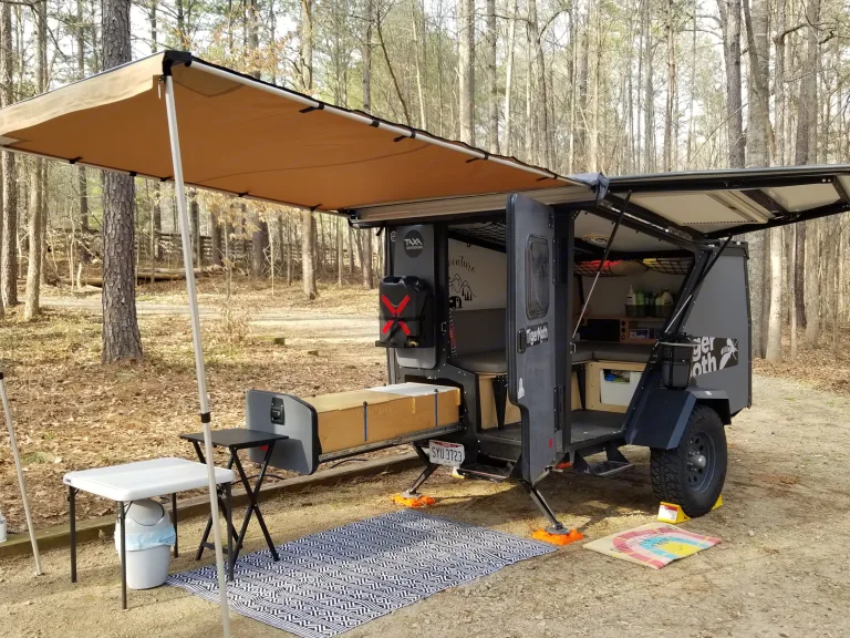 You don't need to BE big to GO big, and this 2019 Taxa Tiger Moth is ready to prove it. It only takes a few minutes to transform this rugged little guy from a spacious gear storage box on wheels to your home on the road -- it is convenient to pack, easy to tow, and efficient to use. At 6' wide and 12' long, the Tiger Moth provides plenty of space for gear, supplies, and comfort while staying small enough to easily maneuver in traffic or on winding roads and to be towed by most vehicles. Consider yourself warned, though – after a getaway in the Tiger Moth, you’ll wonder why you ever tent camped...Want to know more about this re-thought teardrop style trailer, designed by a former Nasa engineer?What's includedYou only need to pack food, drinks, and clothes for your relaxing time away! We provide everything listed below (and more)...Food preparation, cooking, and storage equipment -- Cutting boards, mixing bowls, knives, can and bottle openers, foil, cooking utensils, medium and large pots with lids, a large skillet, 2-burner camp stove (plus propane canisters), 1-burner standalone cooktop, food storage bags and plastic food storage containers, hot pads, trivets, a coffee maker with coffee pods, miniature waffle maker, 5-gallon NATO can with dispensing nozzle for fresh water, dish soap / dish washing bucket / dish drying rack.Eating and drinking -- Plates, bowls, eating utensils, plastic cups with lids and reusable straws, coffee mugs with lids, insulated can and bottle holders.Bedding, linens, and paper products -- Two memory foam pillows and cotton pillowcases, 5 full-sized bath towels and wash cloths, 4 sleep sacks, 1 tablecloth with clips, 4 kitchen towels, paper napkins, paper towels, toilet paper.Toiletries -- Shampoo, conditioner, hand soap, face wash, body wash, toothpaste, bug repellant, hand sanitizer.Entertainment -- Games, cards, Bluetooth speaker.Comfort and convenience items -- Built-in 5,000-BTU window air conditioning unit, dehumidifier, multiple USB charging outlets, indoor and outdoor LED and dim (to avoid night blindness and to minimize moths) lights, 2 plug-in fans, 4 low-profile air mattresses, three inflatable pillows, 5 camp chairs (2 adult and 3 kid), 1 indoor/outdoor folding table (can be set up inside the trailer if needed because sometimes it rains!), 1 folding card table, extra tarps.Safety items -- Secure toolbox on the tongue of the trailer, complete first aid kit, lanterns and head lamps, safety whistles, fire extinguisher.Mechanical items -- 30-amp shorepower cord, water hose, stabilizer jacks, leveling blocks, parking chocks.Additional living space – ARB awning room (mounted above back door for easy, roll-out setup) that can be used with or without netting “walls,” optional netting for trailer doors to allow for airflow without mosquitos.Peace of mind -- 24/7 access to the owners.There is not a toilet or shower in the trailer, but all non-primitive campsites provide potable running water for hand, face, and food washing plus bathhouses a short walk away -- since most RVers prefer to use their onboard toilets and showers, you will likely be the only guest using the toilets and showers at the bathhouse!RecommendationsOur trailer’s home base is a few minutes from downtown Atlanta. Some of our favorite nearby destinations are High Falls, Indian Creek, Hard Labor Creek, Fort Yargo, and Red Top Mountain state parks – with Chattahoochee Bend and F.D. Roosevelt state parks on our to-do list. You can access around 10 Georgia state parks with an hour or less of driving from your starting point, and you’ll be able to reach twice that many parks (Georgia, Alabama, and Tennessee) with only two hours of driving. There is no limit on mileage, so this trailer will go as far as you like!To make your experience even more enjoyable, we can provide any or all of these items for additional fees – various sized coolers, rocking camp chairs, hammocks, 3" memory foam mattress topper, tents, and sleeping bags. Depending on your chosen weekend, we can even book a site and setup your camping station!Other things to noteWell-behaved pets welcome! Please be prepared to comply with any campsite requirements such as leashing animals and picking up poo.Your tow vehicle will need a towing capacity of at least 2,500-pounds (trailer weighs approximately 1,400 pounds empty), a 2” tow ball positioned around 20” high, and a 7-pin connector. Towing experience is preferred but not required -- pull-through sites make for easy parking, and the trailer is light enough that it can be detached from the tow vehicle and pushed on foot to perfect placement within the campsite. If you are unable to tow or prefer not to pick up near downtown Atlanta, we are willing to deliver and set up for up additional fee.Smoking is not allowed inside the trailer.