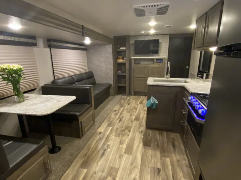 This is an immaculate, comfortable RV. It easily sleeps 6 adults. There is an outside kitchen as well as the inside stove, and an extra outside shower. There is a slide out, and a large TV. The trailer is well insulated, and is cool in summer and warm in winter. There are outside LED lights and a canopy. The trailer can be rented with or without cooking equipment, and with or without towels and linens.
