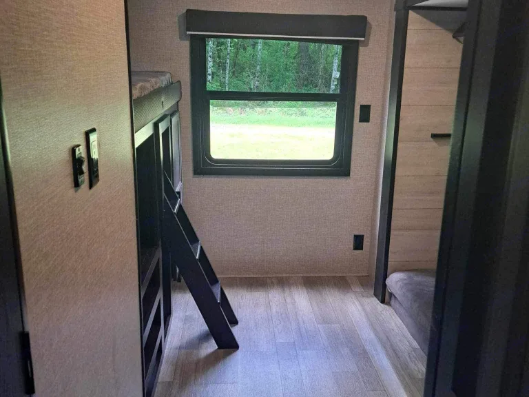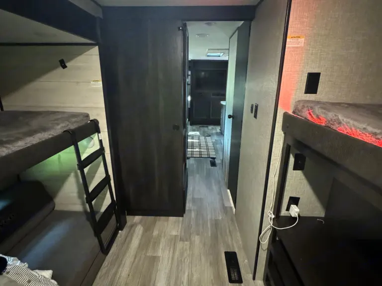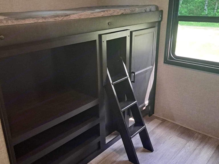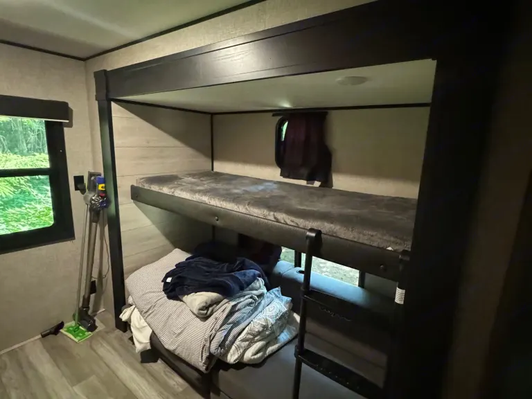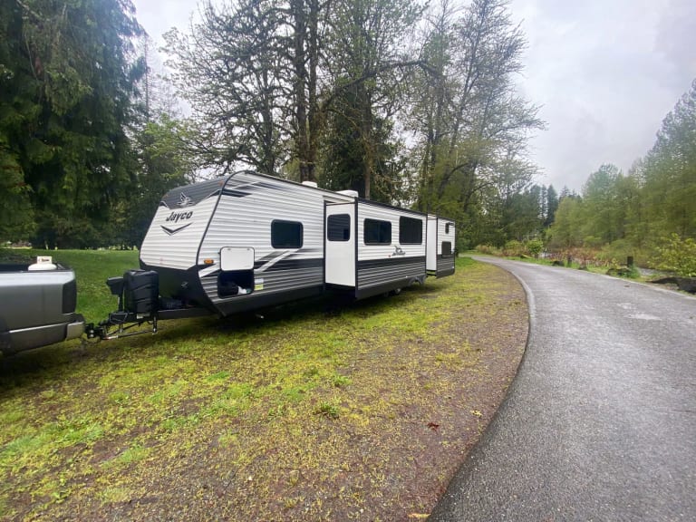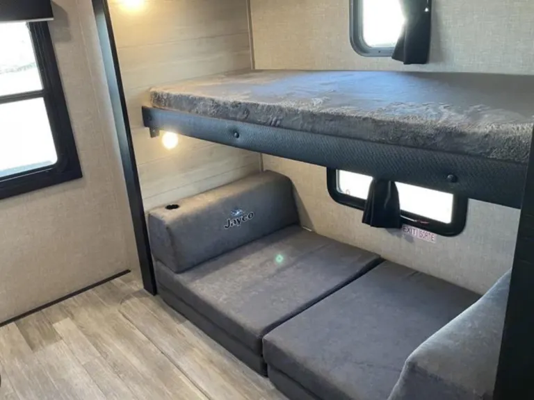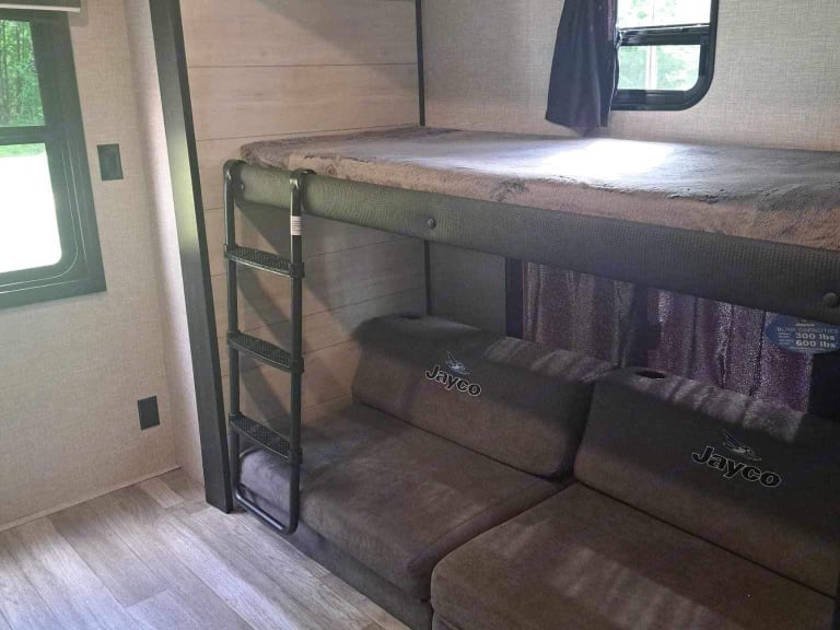 2022 JayFlight 32Bhds, 34ft long, bunk house, double slide outs, extended season insulation package, solar package to extend battery life. RV is cleaned and Covid sanitized between each bookingSleeps 10 comfortably with two separate bedrooms closed off from living space by sliding doors.Master Queen 60in W x 80in L with upgraded 12” deep firm memory foam mattress , storage and wardrobes and has rotating 40in TV from living space to bedroom.Bunk room has a TV hook-up, a 38in W x 73in L top bunk and a 29in W x 73in L top bunk and two Jay Cube chairs with removable back rests that fold into different configurations: 73in W x 80in L king bed or two twins or loveseat or lounge chairs.Large dinette folds down to a generous double bed and loveseat sofa folds out to another double bed.All mattresses and pillows have hygienic waterproof covers.Large rectangular shower with tub base, rounded curtain track and raised skylight for more room and taller elongated toilet for comfort and accessibility.Thermal package and enclosed underbelly for extended camping season, good to 0 degrees Celsius.Solar package to charge battery. Thermostat runs on battery or electric. Furnace runs on propane gas. Water heater can run on either propane or electric or both to speed up heating.Stove and optional BBQ and/or outdoor griddle run on propane with quick connect to RV's propane supply.Back up camera, screen provided.