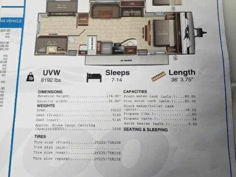 -2 full tanks of propane 80lbsOther things to noteTotal dry weight is 8500lbs, not including contents/cargo. Gross Vehicle Weight Rating: 10,250 lbs. You must distribute weight evenly when towing.RV Specs: