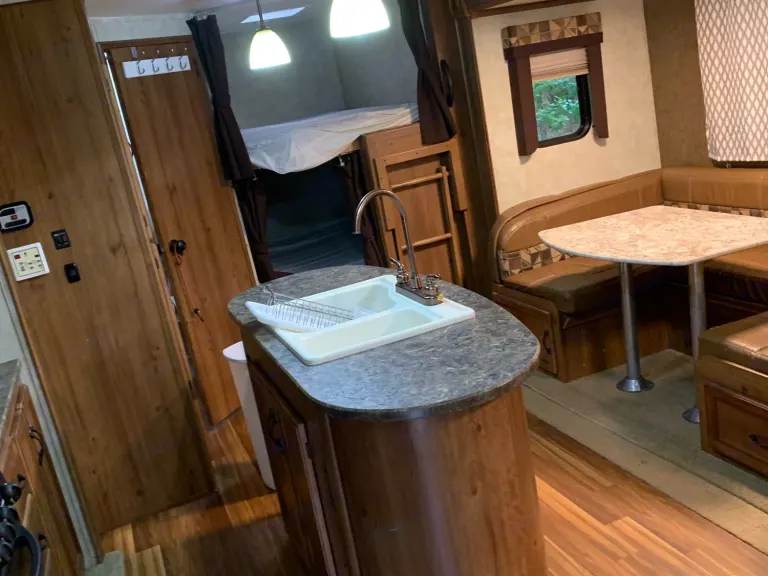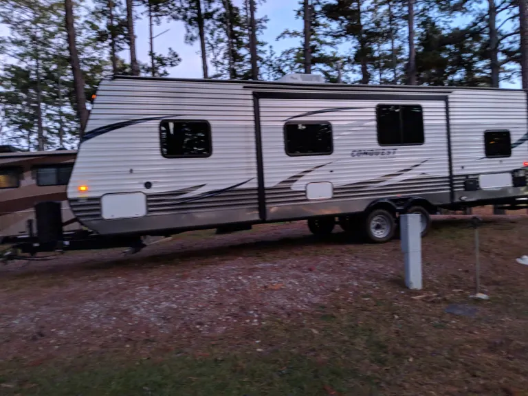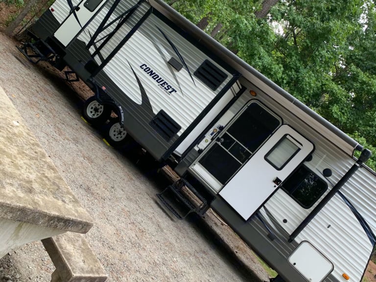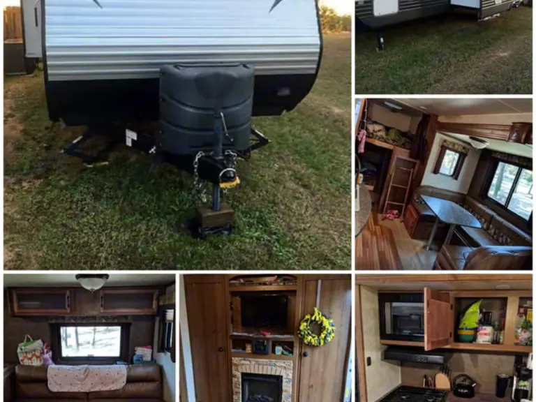 Who doesn’t want to get away?!?!Check out our travel trailer. Let’s face it in the south between the crazy hot days and then rain, it’s nice to be able to relax in a home like setting. Plus with the convenience of not having to leave to use the bathroom. I don’t like walking in the dark to use the bathroom. We love it because we have a secure “master bedroom “ and the kids have bunk beds. It has a fireplace that does help warm the unit in the evening if needed. We love that we can do everything in the trailer cook, shower and even movies because some times you get rained out. Other times we only come in at night or to use the bathroom.So excited for you to contact us to reserve our trailer and your family to create memories.Please contact us regarding times for pickup and drop off.