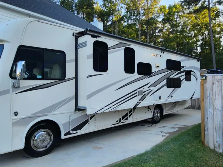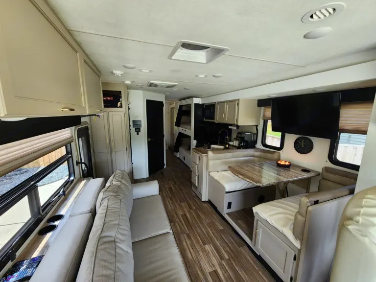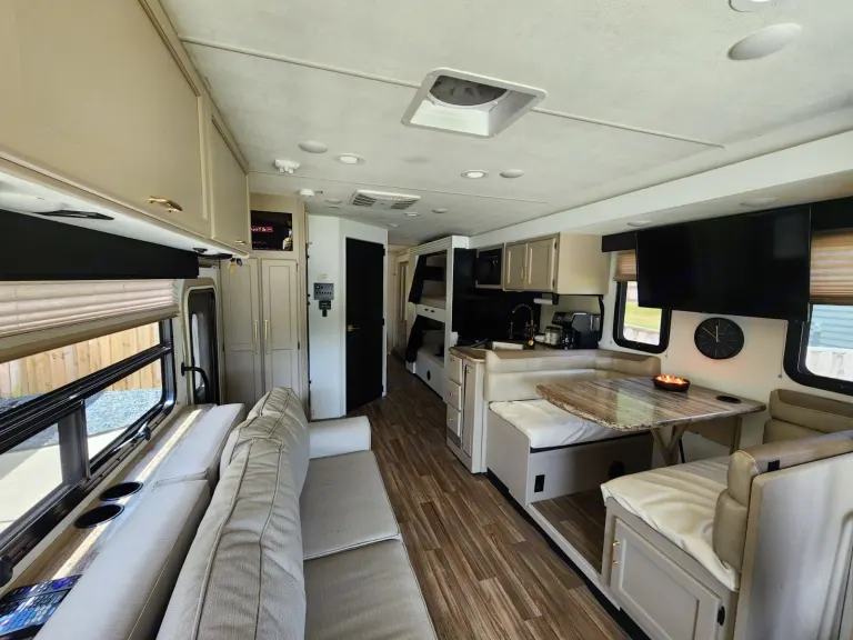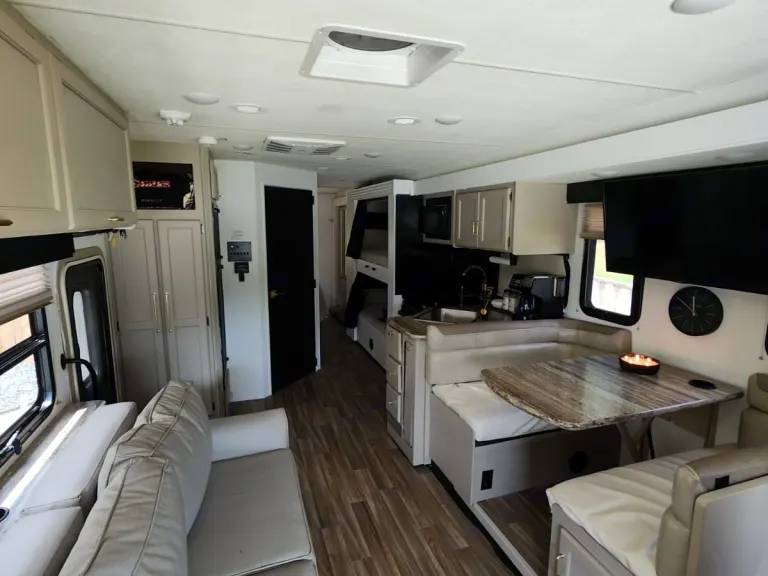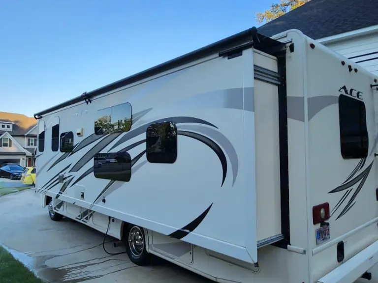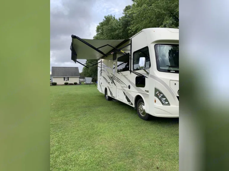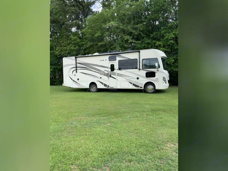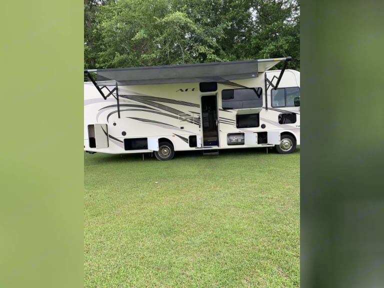 This Thor Motor Coach A.C.E. class A motorhome model 30.2 is a one owner well cared for jewel and all that you need to enjoy traveling the countryside!Step inside and find a sofa to the right of the entrance which can be turned into sleeping area. Across from the sofa is a booth dinette for mealtime and more. The table can be lowered and this area can be turned into a sleeping area. There is a 40" TV above the dinette that can easily be viewed from the sofa and the driver and passengers seat when they are turned around. A convenient coffee table can be put up between the driver / passenger seats for additional table space.The kitchen amenities provide what you need to create meals and snacks on the go. There is a three burner range with microwave oven, single kitchen sink, and overhead storage along with a refrigerator found on the opposite side. There is also a pull-out pantry for your non-perishables. A convenient broom closet is just inside the entry next to the refrigerator.Heading towards the rear of the coach there is a full bath with angled shower, toilet and sink. The bath features dual entry doors which allows easy access from the living area and from the rear bedroom too. Before the bedroom you will find a set of 29" x 71" bunks on the right towards the middle of the full wall slide that the kids or grandkids are sure to love. The bunkbeds have a small tv mounted on the wall at the end of each bed.The rear bedroom features a queen bed with nightstands and overhead cabinets. A closet and dresser along the full wall slide. Above the dresser there is a 32" LED TV for your enjoyment. Their is also a sliding door which can separate the bedroom from the bunkbeds and the rest of the RV.Up front you will find a drop-down overhead bunk for added sleeping space when needed, big enough for 2 adults. Outside there is a 32" LED TV for your watching pleasure plus lots of empty compartments for storage.A towing bar was added to tow a 2012 Chevrolet Equinox. What's includedPlates, Cups, Bowls, forks, spoons, outdoor rug / mats, blackstone gas griddle (for out door cooking), shade drop down for awning, camping chairs, bed linens, blankets and towels upon request.RecommendationsThe RV is in a great spot for Basic Training and AIT graduations at Fort Jackson and Fort Eisenhower.