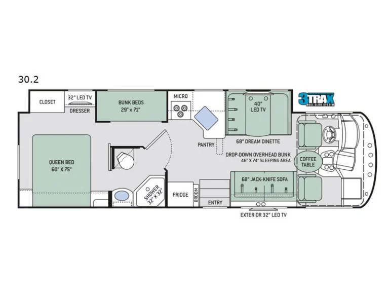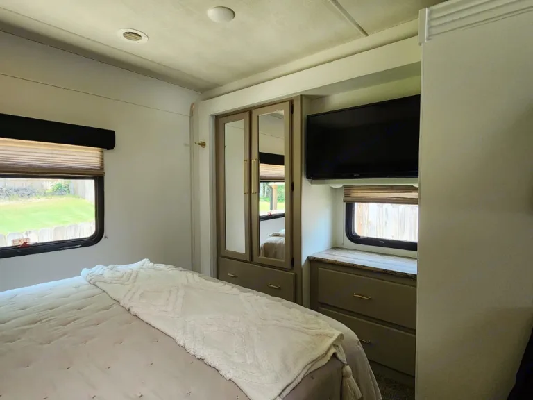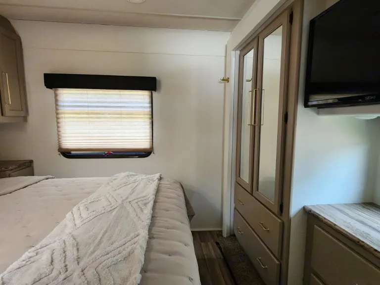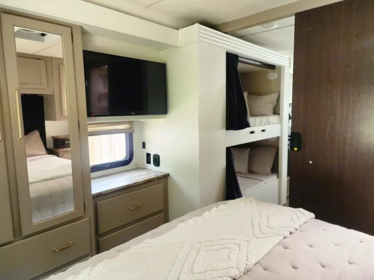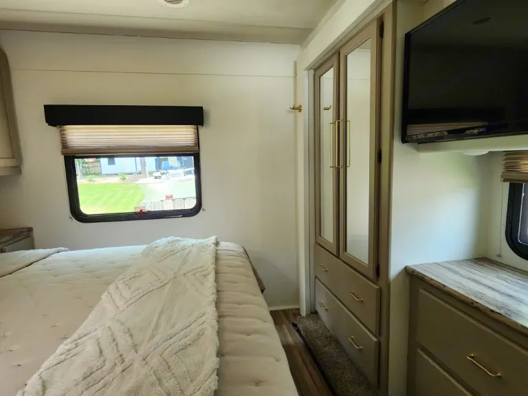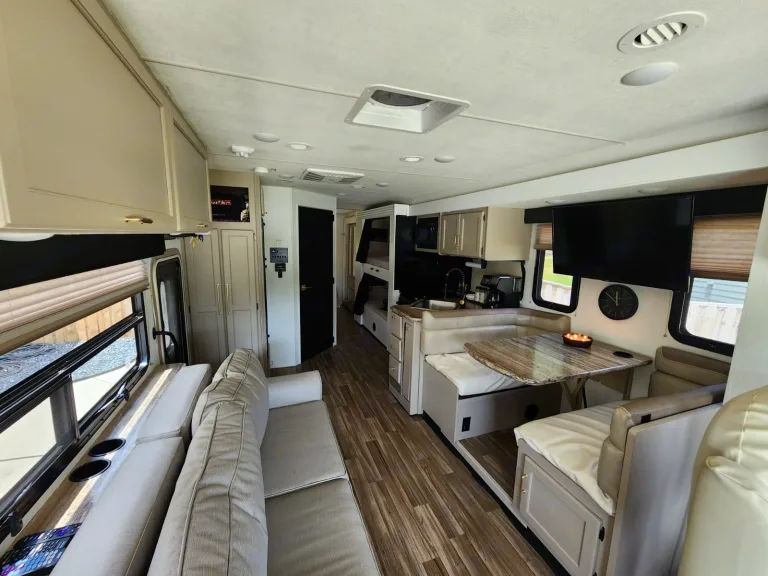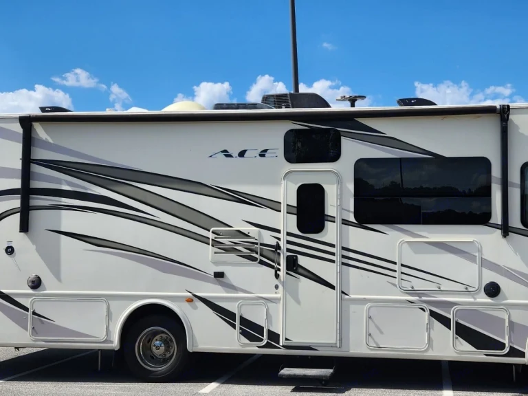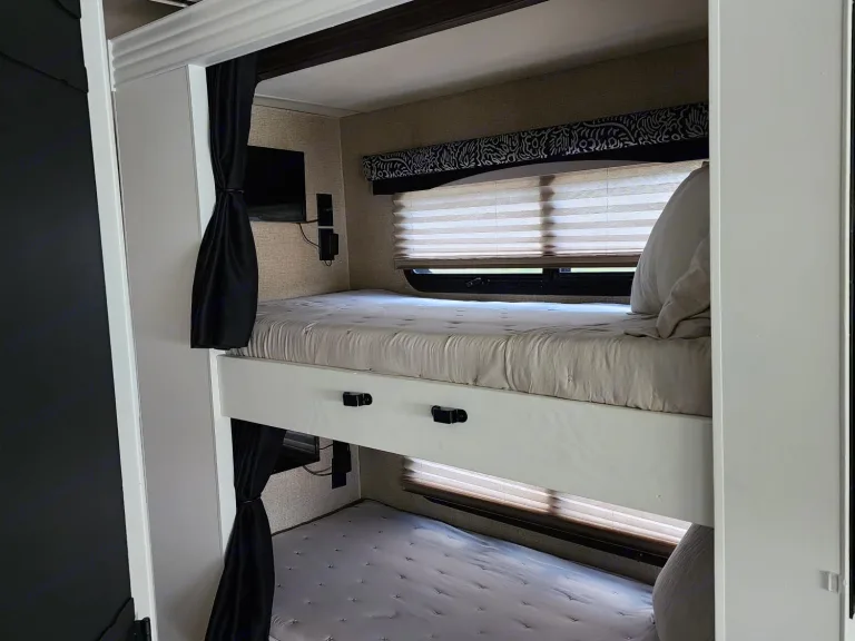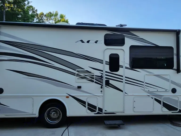 This Thor Motor Coach A.C.E. class A motorhome model 30.2 is a one owner well cared for jewel and all that you need to enjoy traveling the countryside!Step inside and find a sofa to the right of the entrance which can be turned into sleeping area. Across from the sofa is a booth dinette for mealtime and more. The table can be lowered and this area can be turned into a sleeping area. There is a 40" TV above the dinette that can easily be viewed from the sofa and the driver and passengers seat when they are turned around. A convenient coffee table can be put up between the driver / passenger seats for additional table space.The kitchen amenities provide what you need to create meals and snacks on the go. There is a three burner range with microwave oven, single kitchen sink, and overhead storage along with a refrigerator found on the opposite side. There is also a pull-out pantry for your non-perishables. A convenient broom closet is just inside the entry next to the refrigerator.Heading towards the rear of the coach there is a full bath with angled shower, toilet and sink. The bath features dual entry doors which allows easy access from the living area and from the rear bedroom too. Before the bedroom you will find a set of 29" x 71" bunks on the right towards the middle of the full wall slide that the kids or grandkids are sure to love. The bunkbeds have a small tv mounted on the wall at the end of each bed.The rear bedroom features a queen bed with nightstands and overhead cabinets. A closet and dresser along the full wall slide. Above the dresser there is a 32" LED TV for your enjoyment. Their is also a sliding door which can separate the bedroom from the bunkbeds and the rest of the RV.Up front you will find a drop-down overhead bunk for added sleeping space when needed, big enough for 2 adults. Outside there is a 32" LED TV for your watching pleasure plus lots of empty compartments for storage.A towing bar was added to tow a 2012 Chevrolet Equinox. What's includedPlates, Cups, Bowls, forks, spoons, outdoor rug / mats, blackstone gas griddle (for out door cooking), shade drop down for awning, camping chairs, bed linens, blankets and towels upon request.RecommendationsThe RV is in a great spot for Basic Training and AIT graduations at Fort Jackson and Fort Eisenhower.