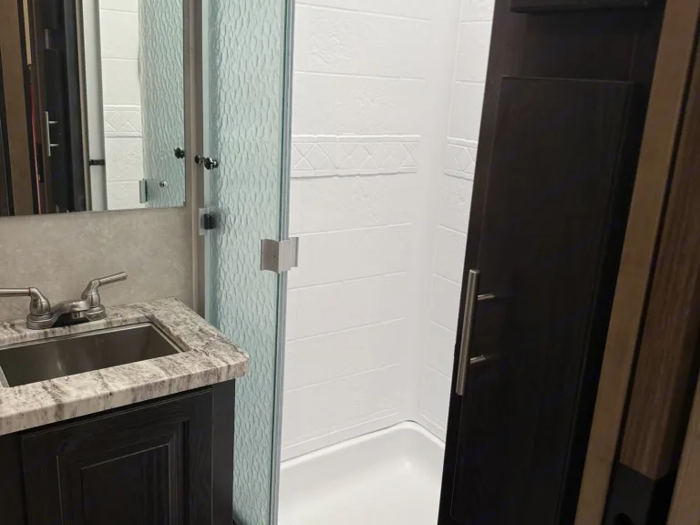 Stand-up shower with glass doorPorcelain toilet & vanityHot water heater (propane/electric)Features: