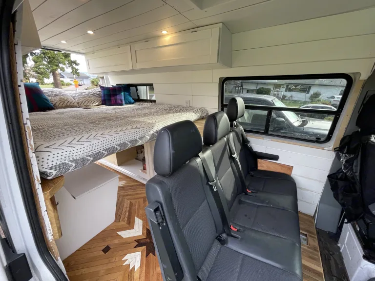 Our basic camper van is perfect for the quick and simple family getaway. We’ve got a bench seat for extra passengers and some electricity for lights and charging!The bed sleeps two comfortably, but we’ve been known to have a little one with us in the bed too. There is also enough room for a camping pad and sleeping bag on the floor if you wanted to sleep another below the bed. What's includedFresh linens, Solar power, USB outlets, an inverter and three outlets for plug-in in smaller items. A bench seat that sits 3.