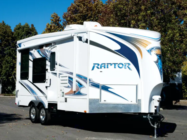 Has a 22-inch LCD TV and AM/FM/CD/DVD stereo. An 8-cubic-foot fridge is the perfect size to hold a full weekend’s worth of cold beverages and food. A three-burner range/oven combo and microwave. The front of the Raptor houses the real star: the incredibly spacious bathroom. Remember the V-nose construction? Well, that leads to a roomy lavy that runs the entire width of the trailer, with the toilet in one corner, and a large tub/shower tucked in the other. Spanning between the two units is the sizable counter, which is larger here in the privy than in the galley — and even has a cable jack for those “extended stays” in the bathroom. The extra countertop is actually a product of the enclosed LP-gas cylinders; the compartment they’re housed in makes for a flat surface giving an abundance of space.