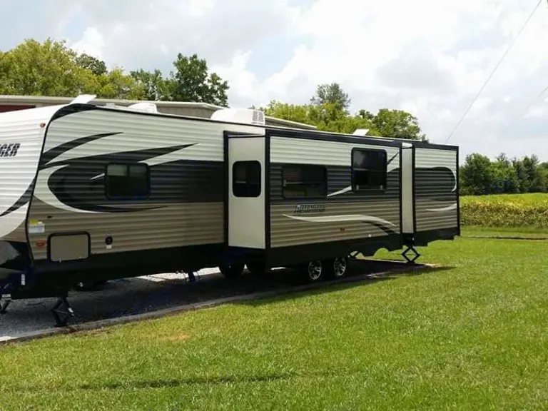 The triple slide 32BIT Avenger travel trailer by Prime Time Manufacturing offers so many great features, such as, a rear bunk house, outside kitchen, and a kitchen island!As you enter this travel trailer, you will be in the kitchen and living area. To the left of the entry door there is a slide out with a three burner range, refrigerator, and overhead cabinet. In the middle of the kitchen you will find a kitchen island with a double kitchen sink. The opposite side has a slide out with a u-dinette and sofa. Both the dinette and sofa easily convert into additional sleeping space at night. To the right of the entry door there is a closet where you can hang your coats, and along the bathroom wall you will find an entertainment e rear bunk house is a place that your kids will claim as their own! There is a dinette slide out with a bunk above. The opposite side has a wardrobe, TV/storage, and a the bathroom you will find a toilet, corner shower, and sink. A sliding door leads you from the bathroom directly into the e front bedroom offers a queen bed, and two closets, and an overhead cabinet. Outside you will find an outdoor kitchen with a two burner range, refrigerator, and sink. This will make food preparation a bit easier and you are able to spend more time outside!Let the 32BIT Avenger travel trailer take you on your next camping trip!