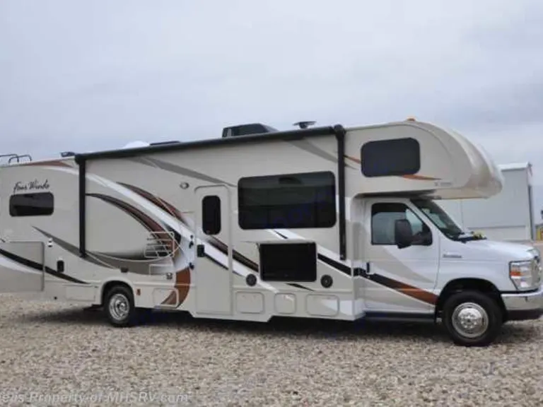 Unlimited Mileage!! We offer special military, first responder, and repeat customer discounts! 2017 Thor Motor Coach Four Winds Class C RV Model 31E bunk model with Ford E-450 chassis, Ford Triton V-10 engine & 8,000 lb. trailer hitch. This unit measures approximately 32 feet 7 inches in length with a full-wall slide-out room, (2) LCD TVs with DVD player combo in the bunk beds and fully automatic leveling jacks. Options include the Premier Package which features a solid surface kitchen counter-top, roller shades, electronics power charging station, kitchen water filter system, LED ceiling lights, black tank flush, 30" OTR microwave and a coach radio system with exterior speakers. Additional options include the all new HD-Max exterior color, exterior TV, leatherette sofa, leatherette booth dinette with dream dinette, child safety tether, attic fan, upgraded A/C, second auxiliary battery, spare tire, heated remote exterior mirrors with side cameras, power drivers seat, leatherette driver & passenger chairs, cockpit carpet mat and dash applique. The Four Winds Class C RV has an incredible list of standard features for 2017 as well including heated tanks, power windows and locks, power patio awning with integrated LED lighting, roof ladder, in-dash media center w/DVD/CD/AM/FM & Bluetooth, deluxe exterior mirrors, oven, microwave, power vent in bath, skylight above shower, Onan generator, auto transfer switch, cab A/C, battery disconnect switch, auxiliary battery (2 aux. batteries on 31 W model), water heater and the Rapid Camp remote system. Rapid Camp allows you to operate your slide-out room, generator, power awning, selective lighting and more all from a touchscreen remote control.