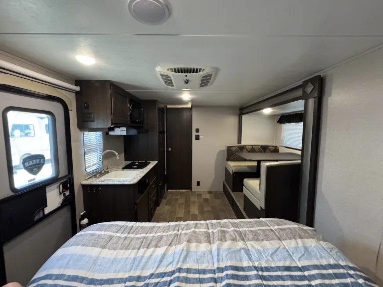 The 2019 Keystone Springdale Mini 1790FQ is a lightweight, compact travel trailer built for couples or small families who want comfort and convenience in a towable RV. At just over 21 feet long and under 3,500 lbs dry weight, it’s easily towable by many midsize SUVs or trucks. Inside, it features a cozy queen bed, a dinette that converts to extra sleeping space, and a functional kitchen with a fridge, microwave, and 2-burner stove. The bathroom includes a tub/shower combo with a skylight and vanity. With thoughtful touches like LED lighting, underbed storage, power awning, and backup camera prep, this trailer is well-equipped for weekend getaways or longer adventures. Its compact size makes it ideal for tighter campsites without sacrificing comfort.